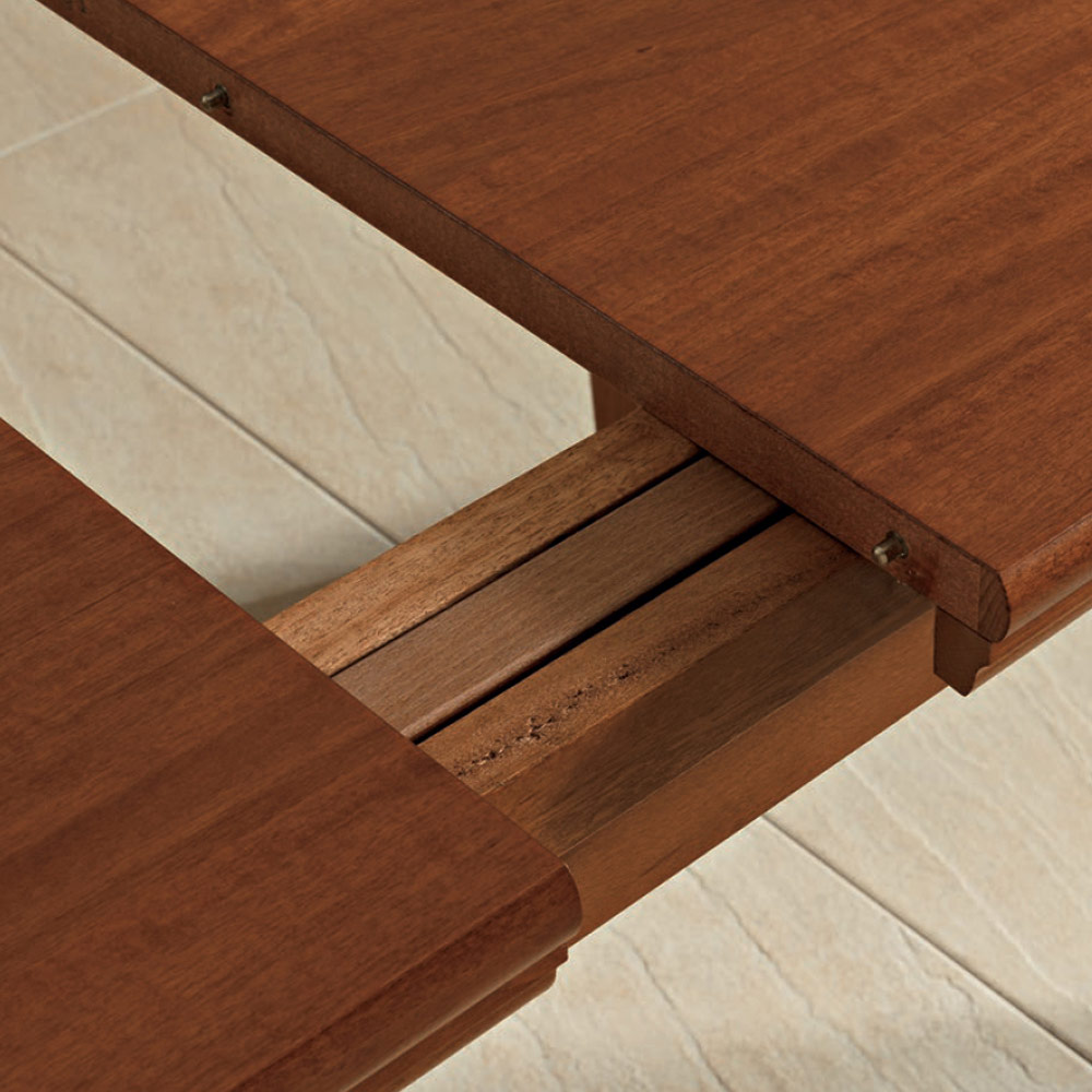 La table à manger extensible a un plateau rectangulaire en bois plaqué de 25 mm d'épaisseur plus une bande de 25 mm de hauteur et une base de 4 à 8 pieds en bois de hêtre massif . Grâce à la possibilité d'extraire 4 étagères de 55 cm chacune contenues dans le cadre avec ouverture centrale et guides en bois , la table peut accueillir de 6 à 14 personnes.