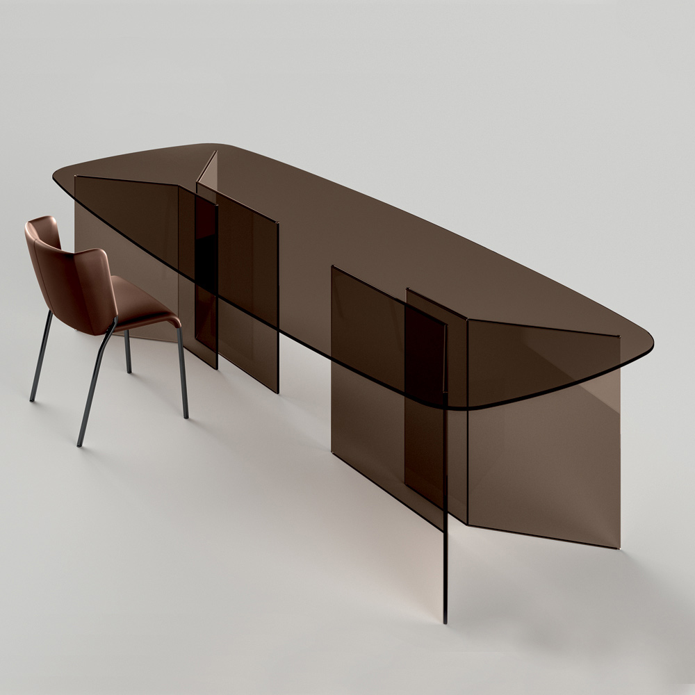 Table à manger entièrement en verre ultra-résistant avec un plateau en forme rectangulaire. Un complément au caractère raffiné issu d'un processus de production 100% Made in Italy grâce à des artisans qualifiés experts dans le traitement du verre, un matériau unique qui donne vie à une table design précieuse.