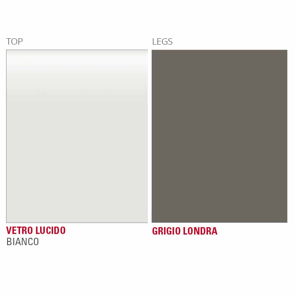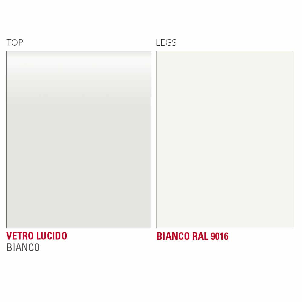 Table de cuisine avec plateau en verre blanc et structure en métal Made in Italy.