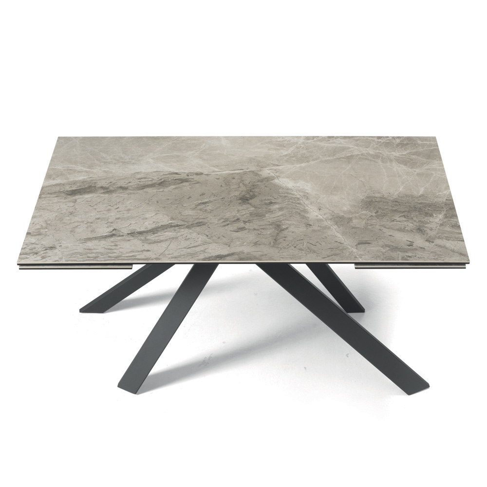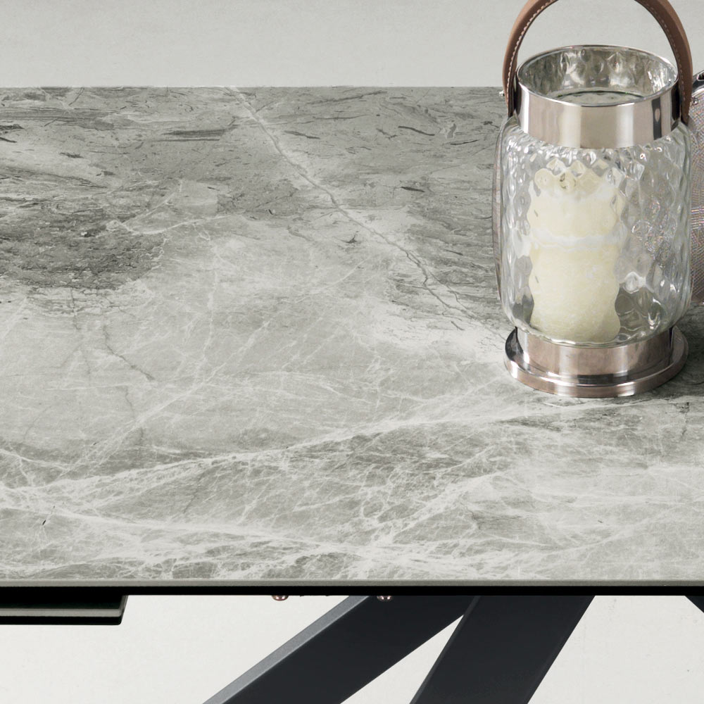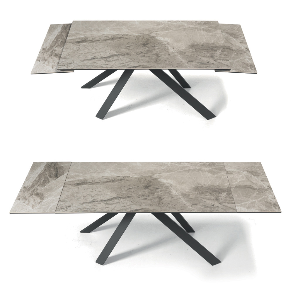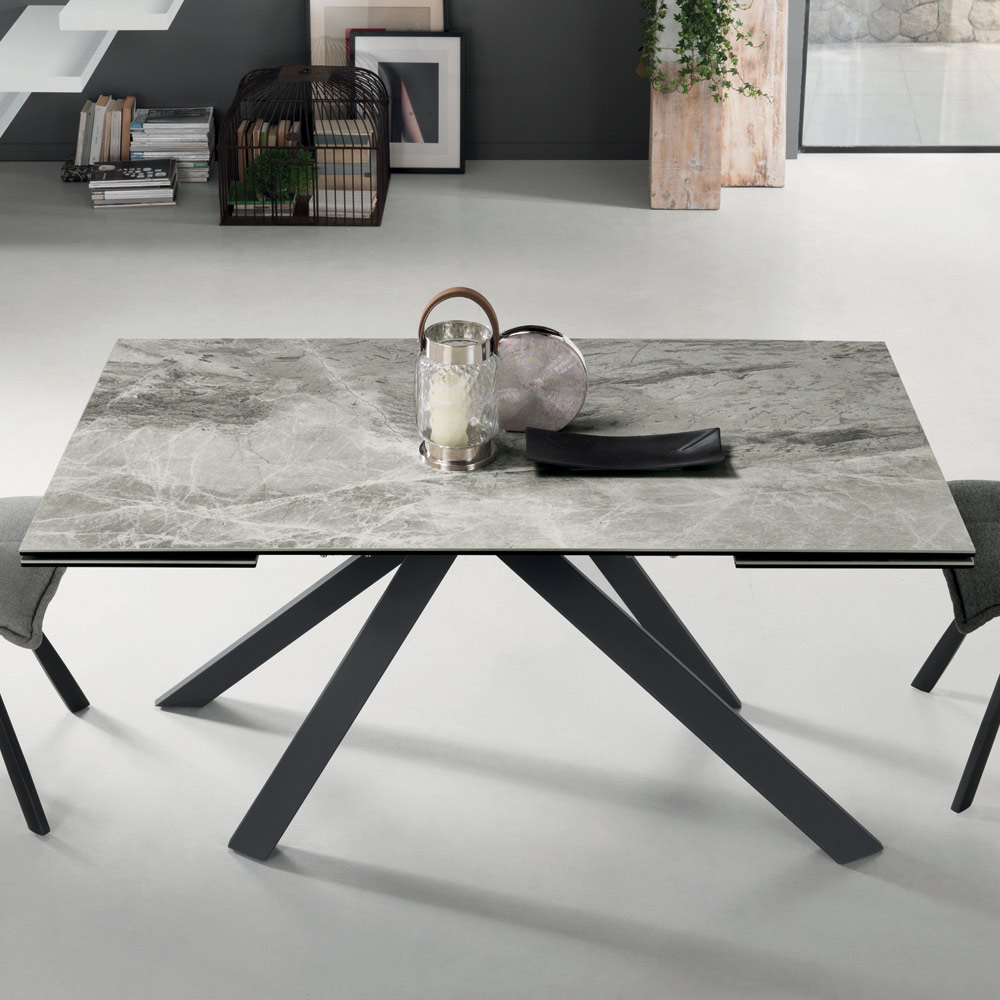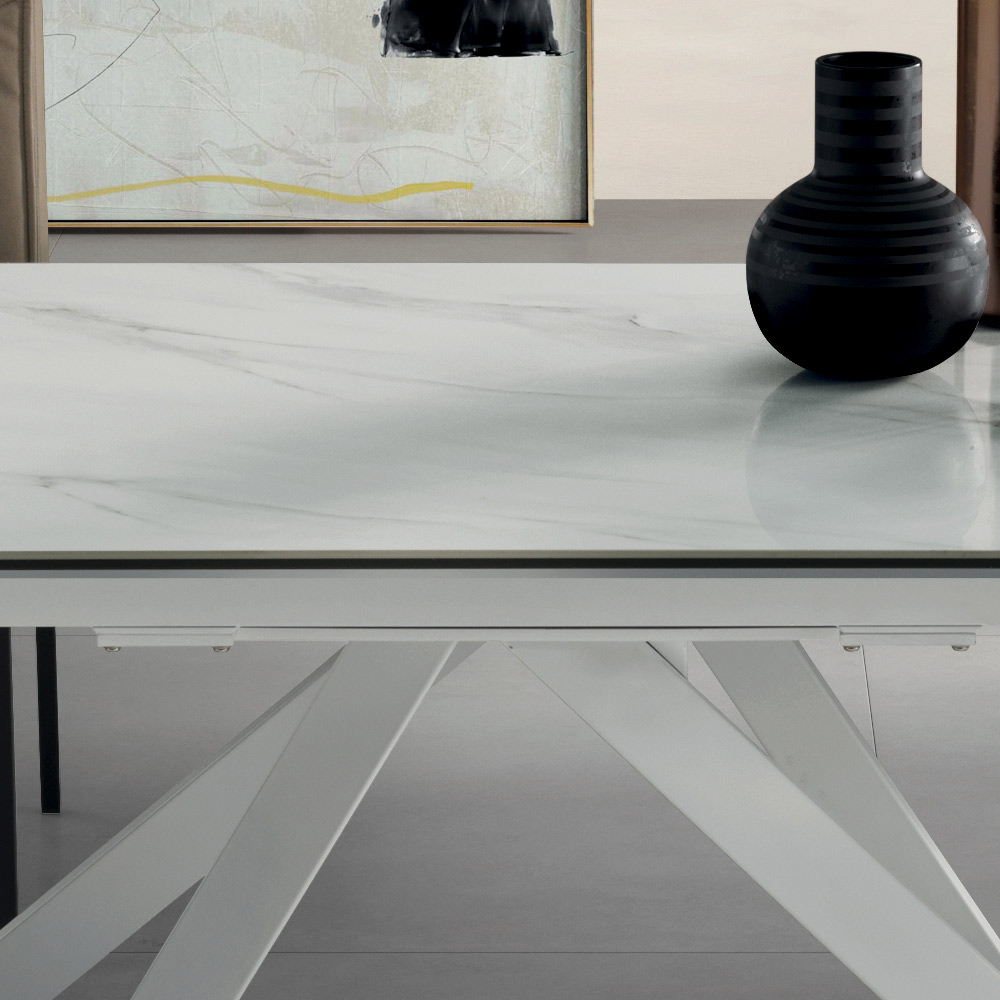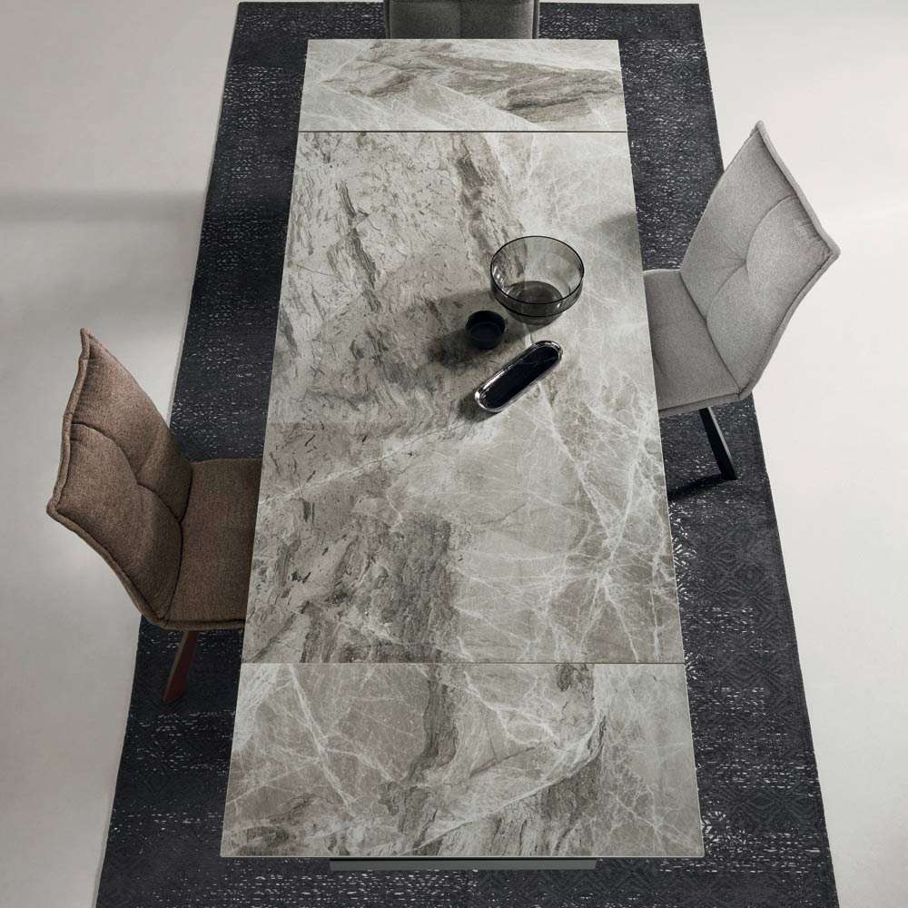 Table à manger avec plateau en grès cérame effet marbre extensible jusqu'à 240 cm grâce aux deux rallonges de 40 cm fournies et structure en métal peint . Ce produit est parfait pour ceux qui aiment organiser des déjeuners et des dîners entre amis sans sacrifier le style et l'élégance.