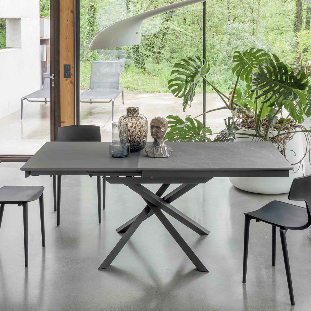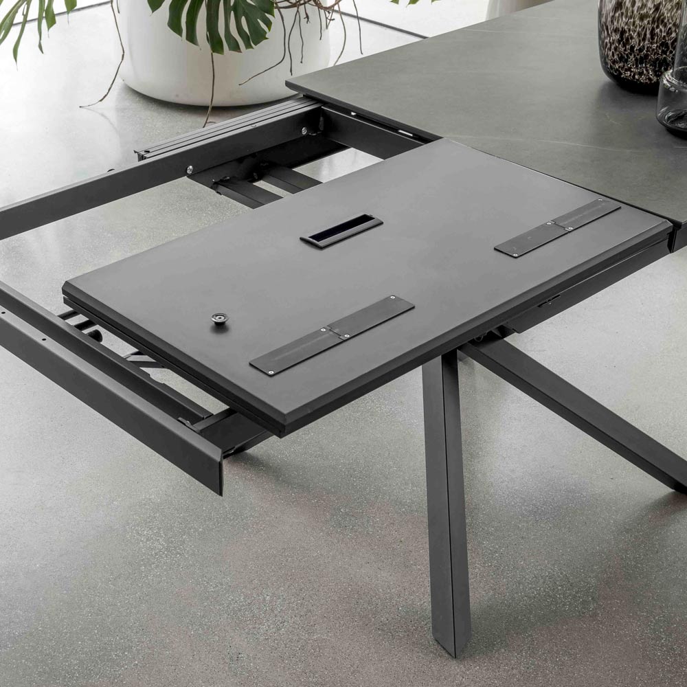 plateau en céramique pierre grise mate, rallonge en mélaminé anthracite et piètement en métal finition graphite gaufré