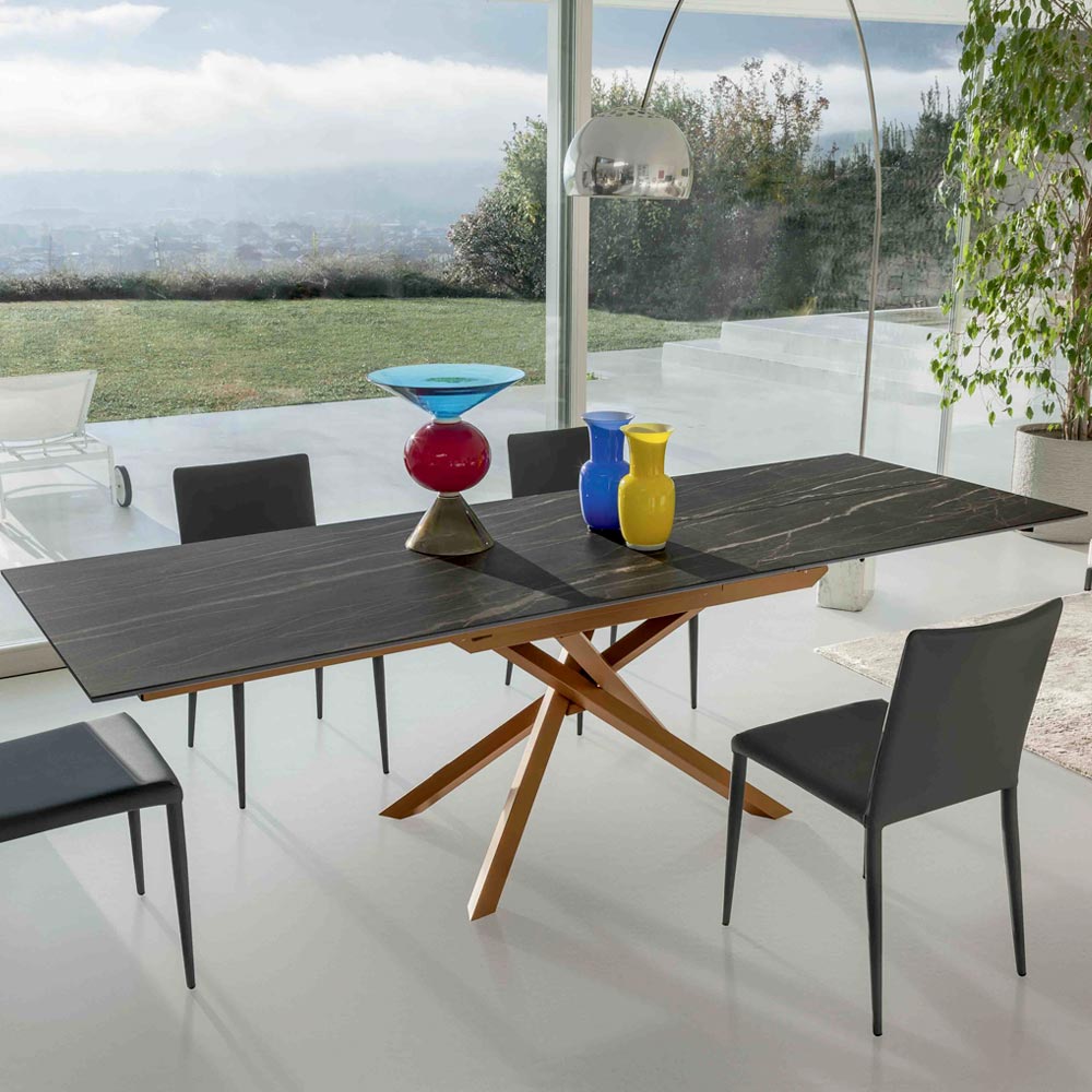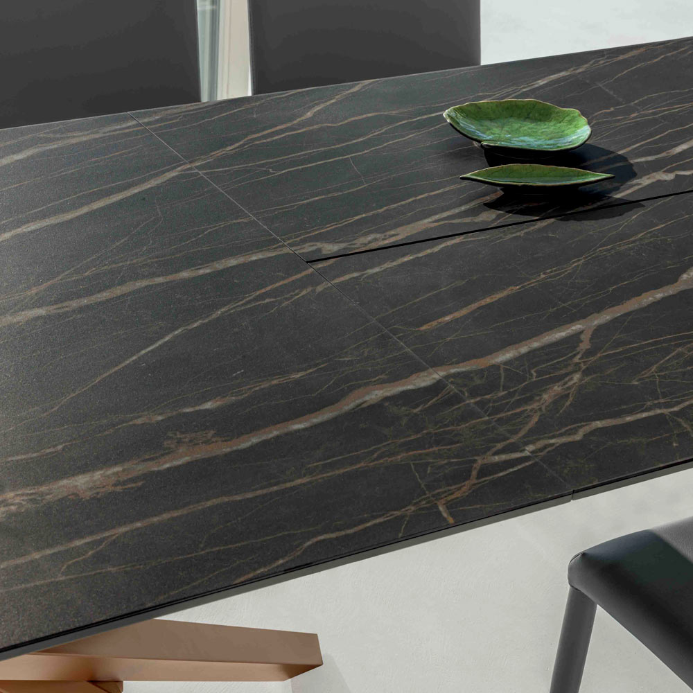 plateau en céramique désir noir mat, rallonge en céramique désir noir mat avec veinage continu et base en métal finition cuivre gaufré