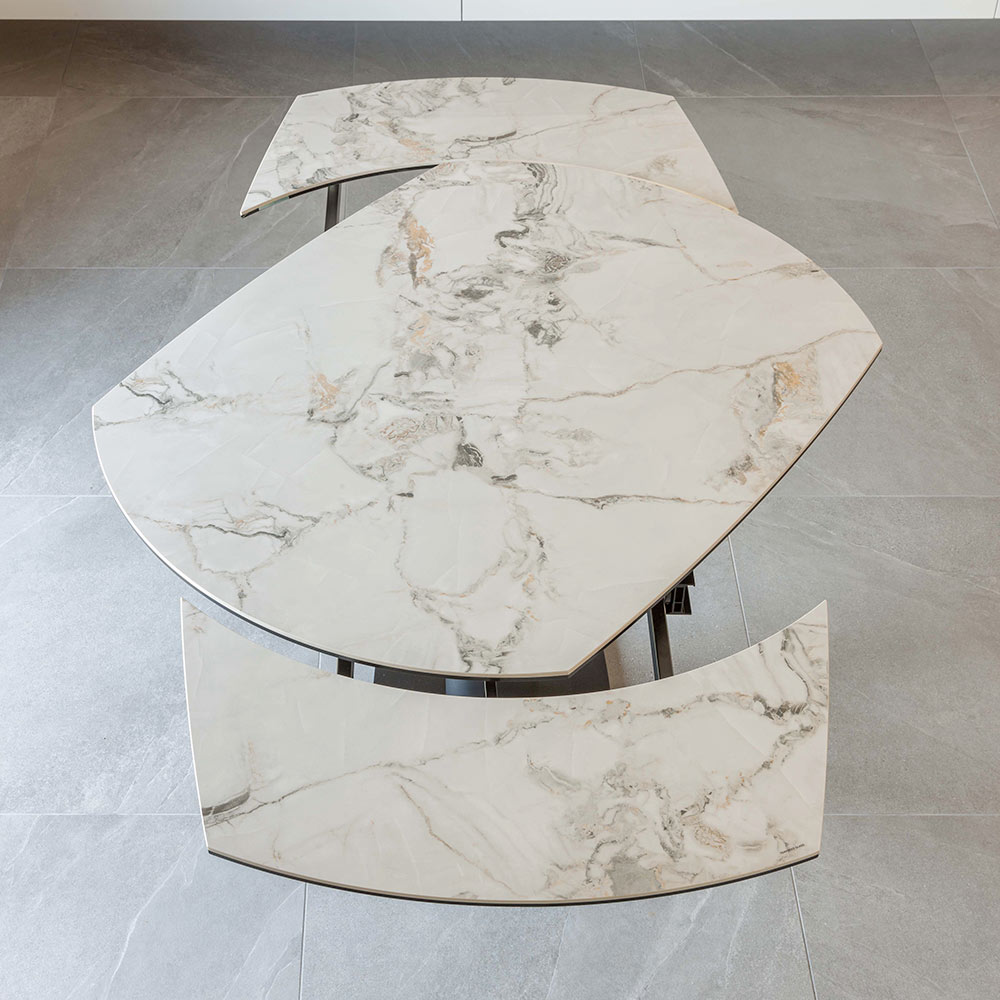 Table à manger extensible réalisée avec un plateau composé d'une couche inférieure de verre (8 mm d'épaisseur) et une couche supérieure en céramique (6 mm d'épaisseur) et une base en métal peint en noir.