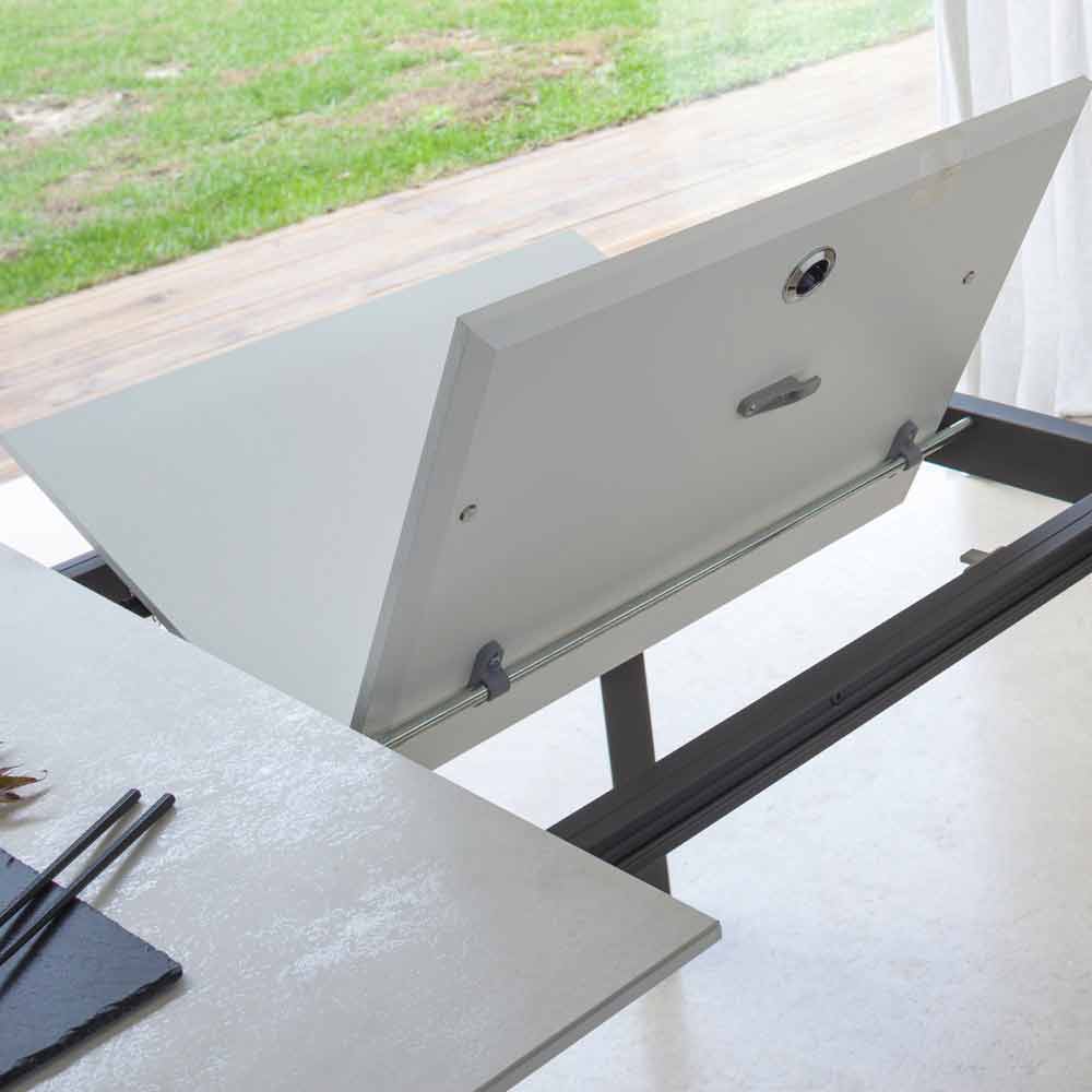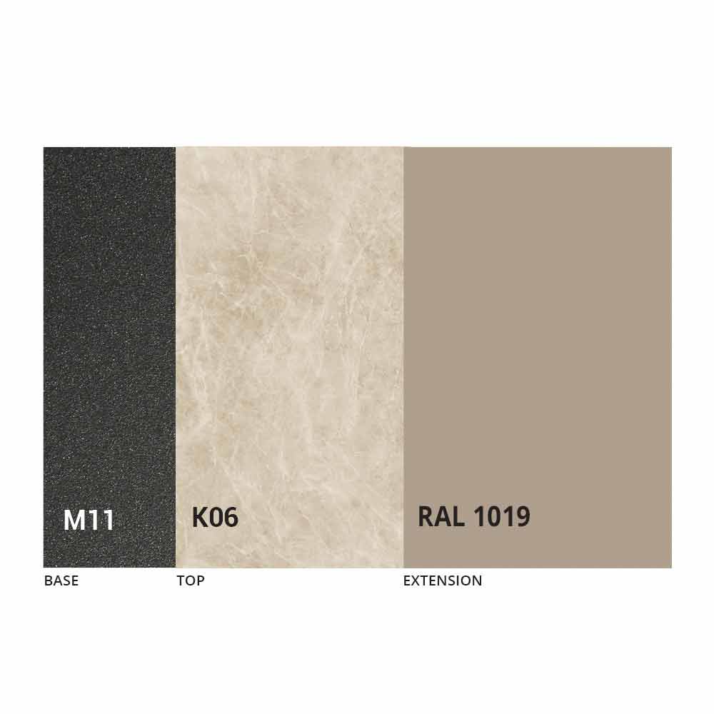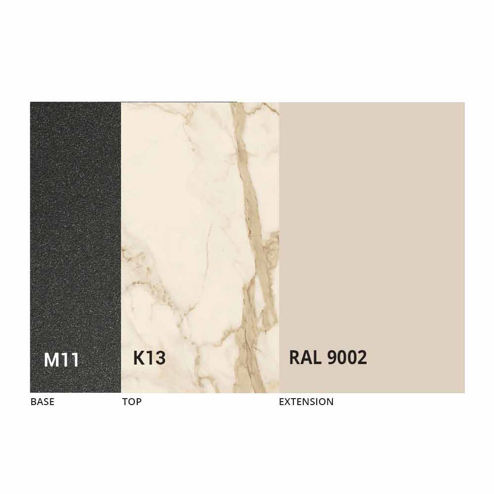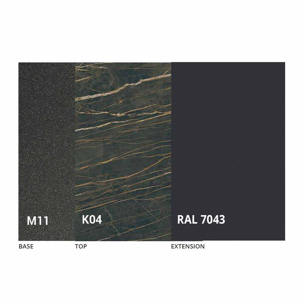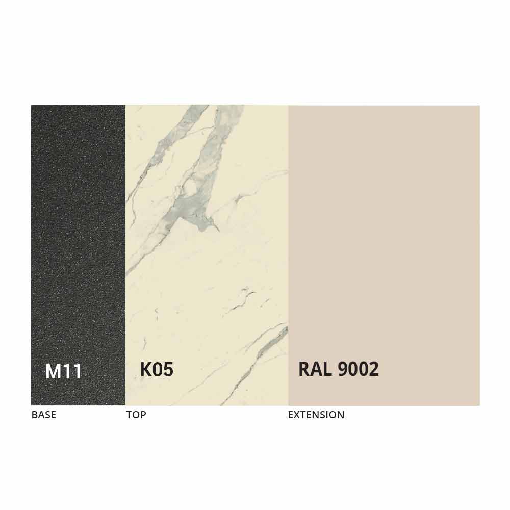 NB : lors de l'ouverture de la table, il est nécessaire de soulever la rallonge, de la positionner au niveau du plateau et, ensuite seulement, de l'ouvrir. Le plateau et la base de la table peuvent être personnalisés avec différents matériaux et finitions d'échantillons ou laquage RAL. Pour plus d'informations, contactez-nous en utilisant le formulaire " Demande d'informations" approprié.