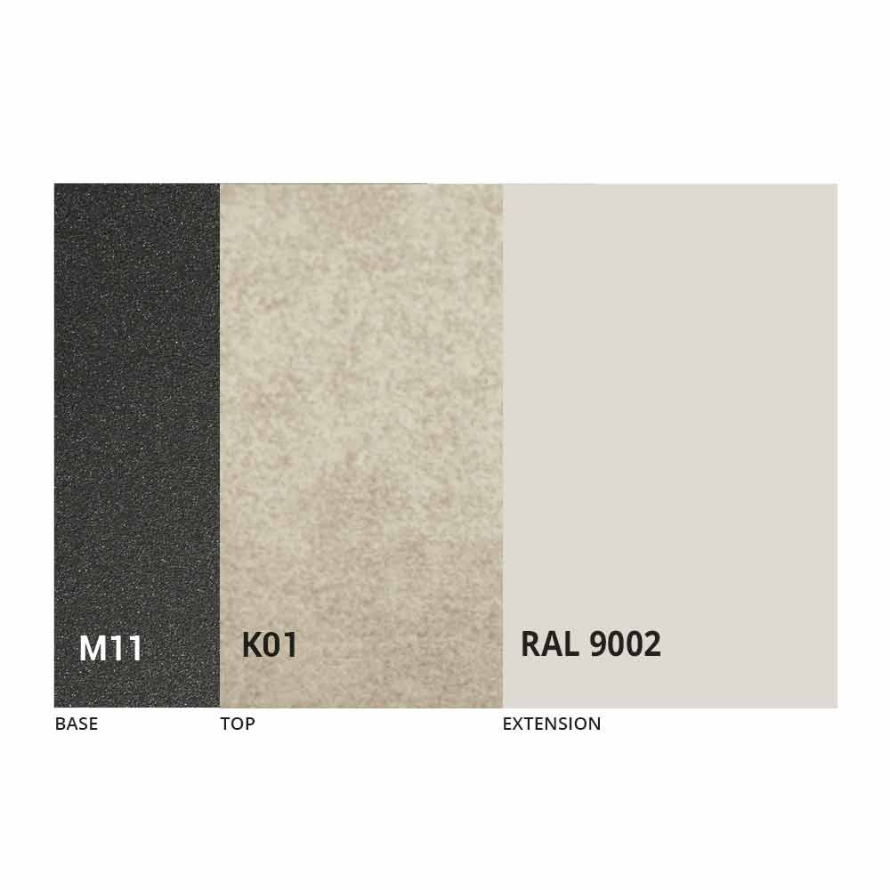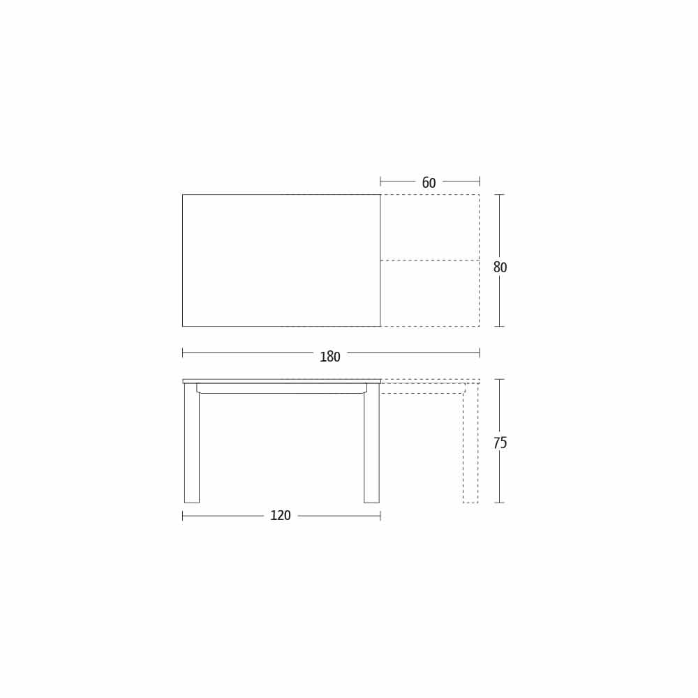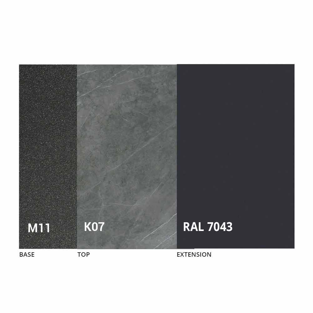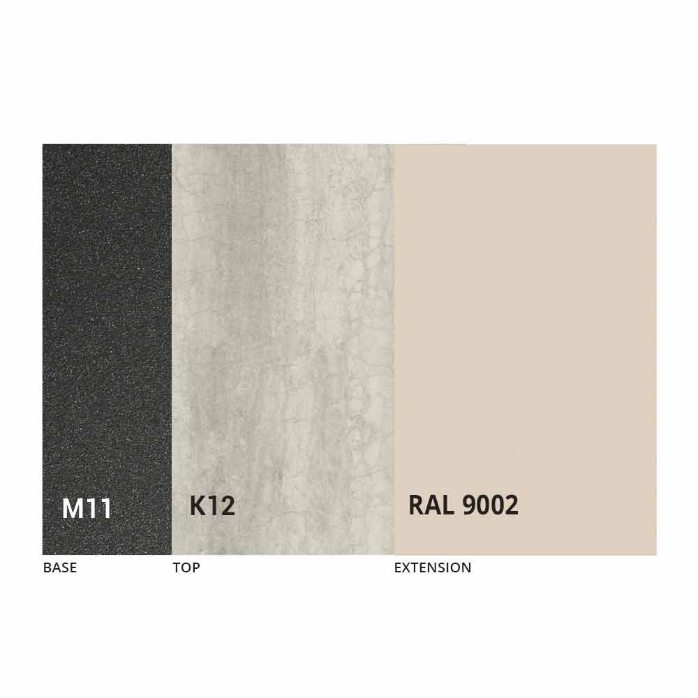 NB : lors de l'ouverture de la table, il est nécessaire de soulever la rallonge, de la positionner au niveau du plateau et, ensuite seulement, de l'ouvrir. Le plateau et la base de la table peuvent être personnalisés avec différents matériaux et finitions d'échantillons ou laquage RAL. Pour plus d'informations, contactez-nous en utilisant le formulaire " Demande d'informations" approprié.
