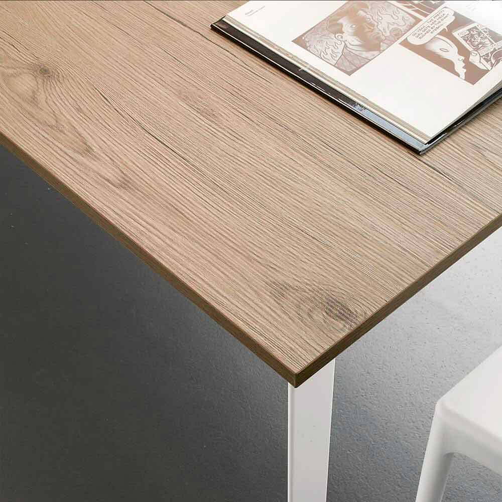 Table à manger fabriquée en Italie avec plateau en mélaminé (épaisseur 20 mm) avec finition écorce, rallonge en mélaminé assortie au plateau et base en métal peint blanc .