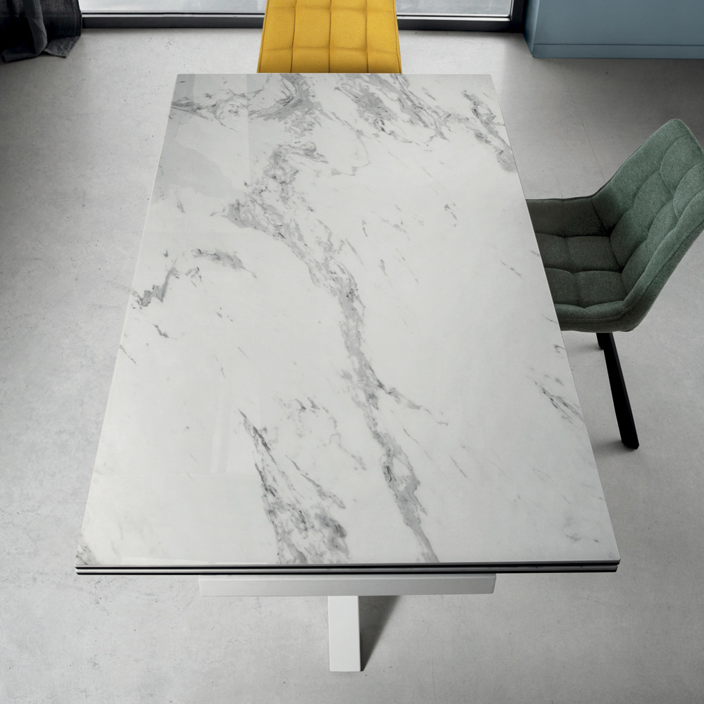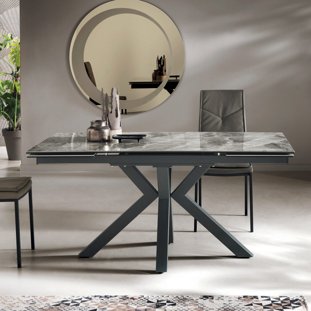 Table à manger extensible avec plateau en grès cérame effet marbre et base en métal peint aux lignes simples et modernes, capables de donner du caractère à votre environnement. Equipé de 2 rallonges latérales de 40 cm et d'un mécanisme de rotation qui permet d'allonger le plateau de table rapidement et facilement pour un résultat fonctionnel et particulièrement original .
