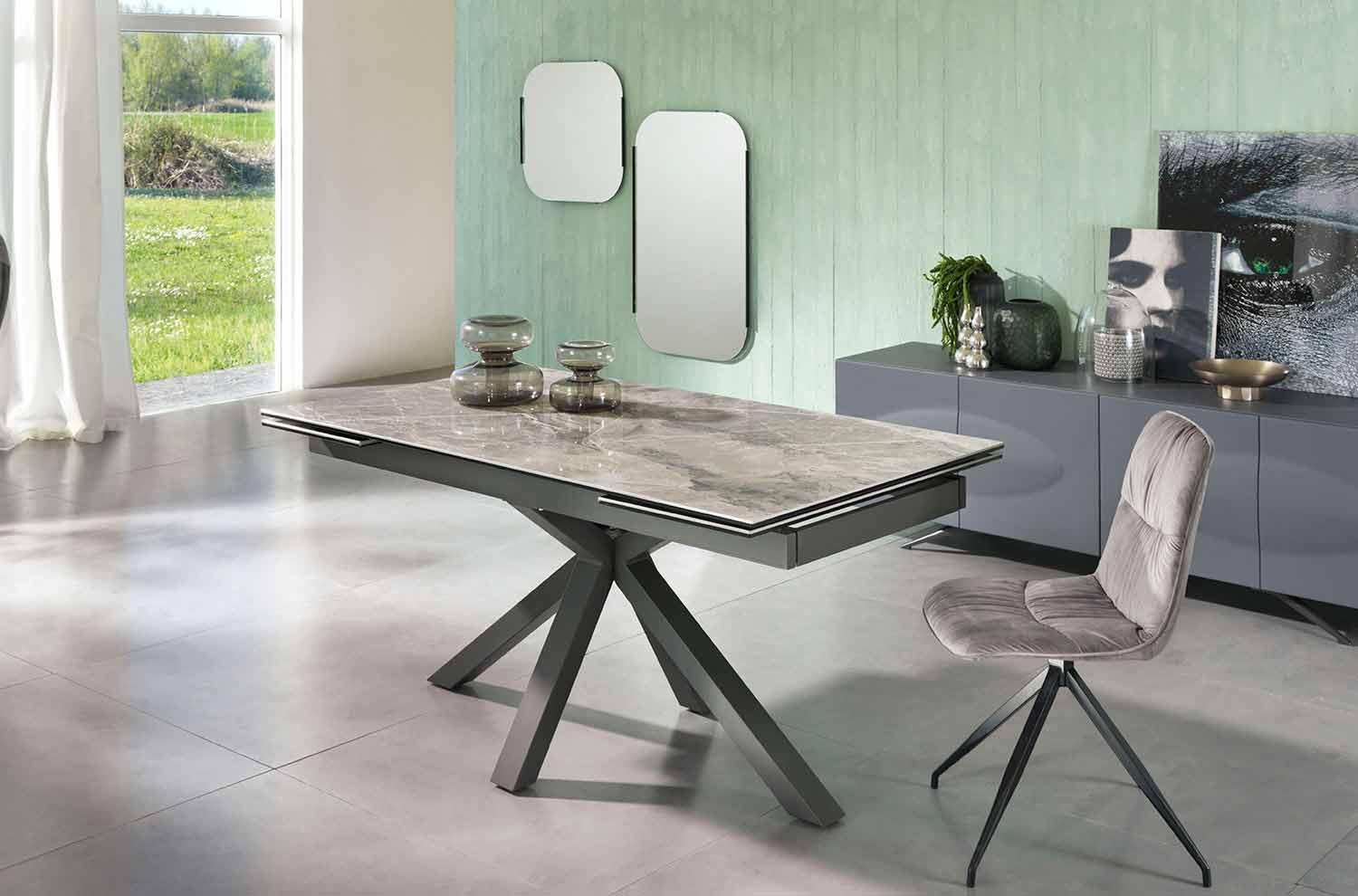 Laryssa est une table à manger caractérisée par l'utilisation de matériaux innovants et résistants qui en font une table parfaite pour la salle à manger ou la cuisine, alliant beauté et praticité, permettant ainsi une utilisation optimale et en même temps donnant du style à n'importe quel environnement. La table est réalisée avec une structure en métal peint anthracite et un plateau en céramique sur verre trempé, également de couleur anthracite, ce qui rend la table solide et résistante. Les rallonges se trouvent à l' intérieur de la table et sont également en céramique sur verre de couleur anthracite.