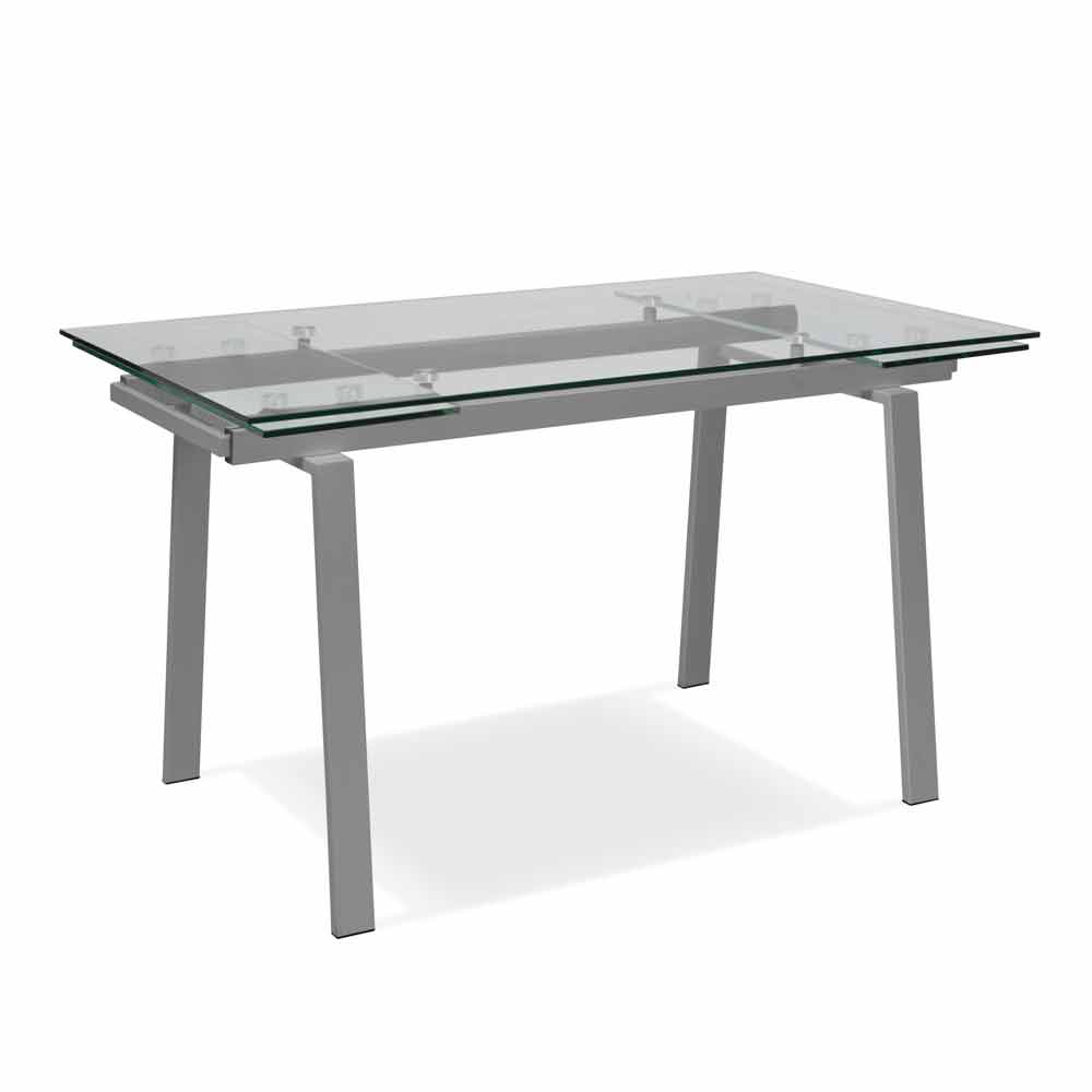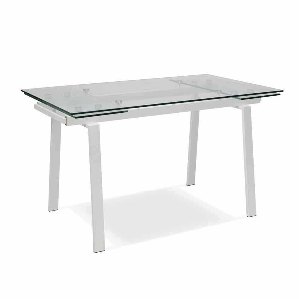 Table design extensible avec base en métal peint. Plateau et extensions en verre trempé transparent. Nardo est une table extensible jusqu'à 200 cm avec des dimensions: l.140 / 200 x p.80 x h.76 cm.
