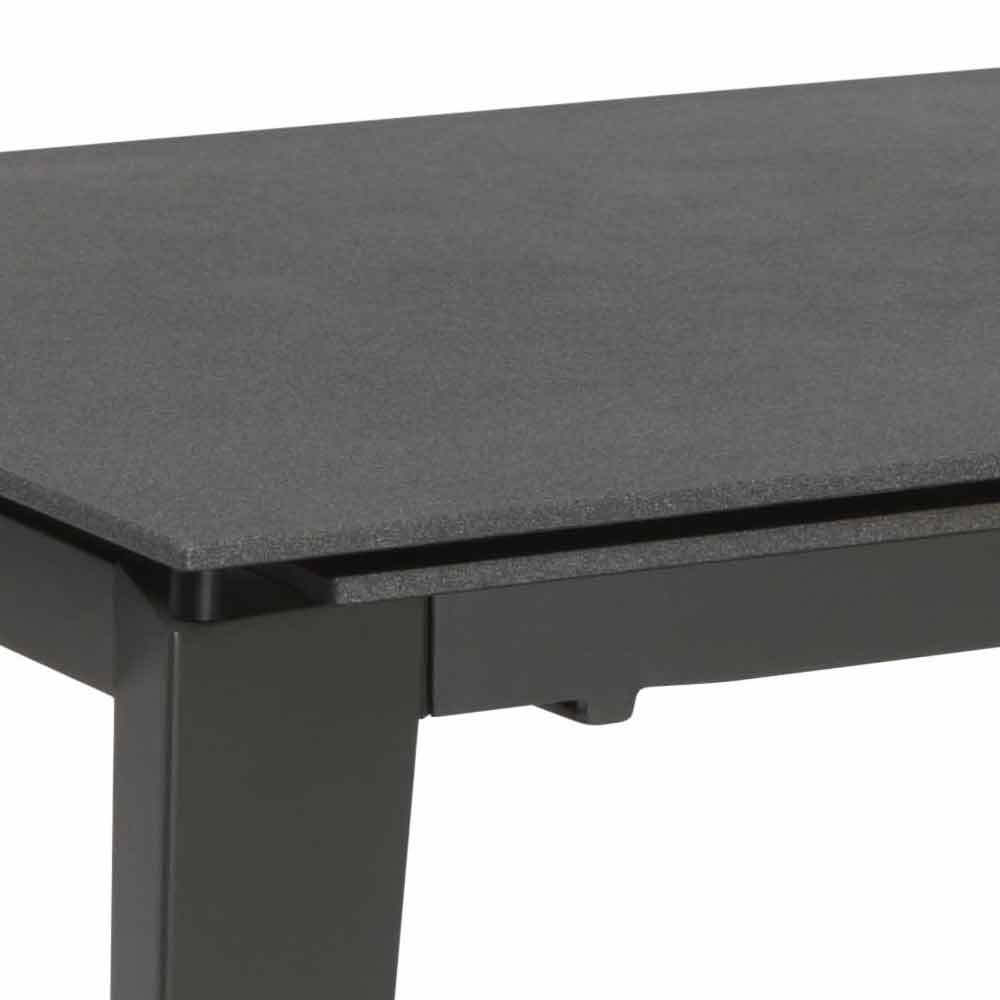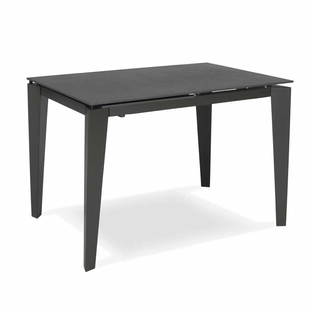 Table extensible rectangulaire avec base en métal peint mat. Plateau et extension en verre et céramique (couche inférieure en verre, couche supérieure en céramique). Grâce à l'extension pratique, il est possible d'étendre la table jusqu'à une longueur de 170 cm.