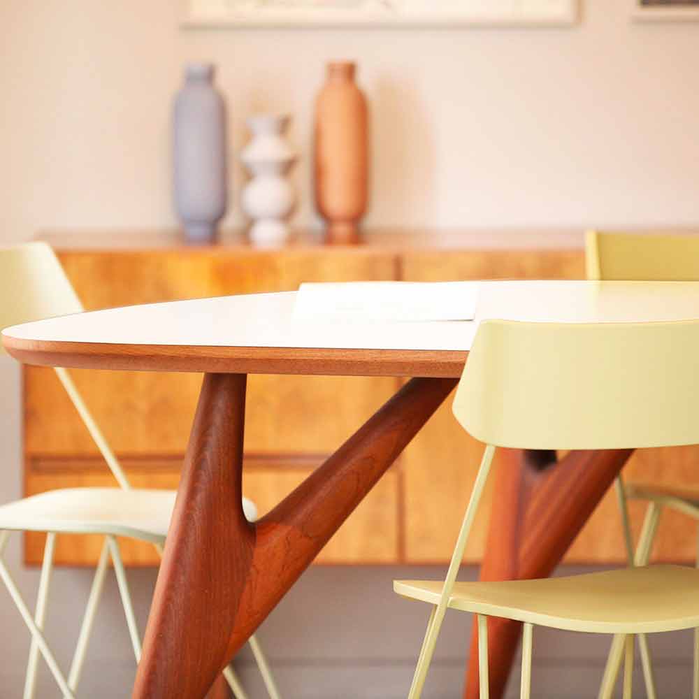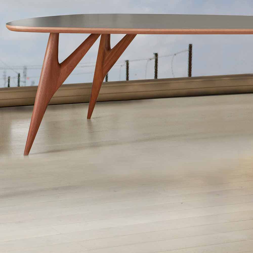 L'élégance intemporelle du bois massif se combine à la modernité du HPL pour donner vie à une solution d'ameublement au style inégalé capable de s'adapter à n'importe quel environnement, apportant avec elle une touche créative et chic et devenant le véritable protagoniste de l'intérieur de la pièce . Du choix d'utiliser des matières premières de haute qualité et de haute qualité savamment travaillées par des artisans experts , une idée d'ameublement révolutionnaire est née, caractérisée par la forme délicate de la voile du dessus et la fourche originale des jambes qui enrichit le design. Ces particularités permettent à la table de transmettre une sensation de légèreté et en même temps de créer une incroyable harmonie avec le mobilier environnant, conquérant ainsi chaque espace.