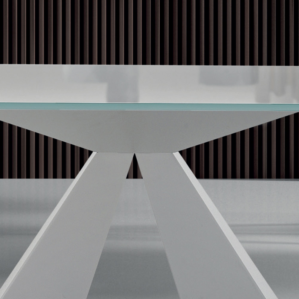 Table rectangulaire moderne fabriquée artisanalement en Italie, en verre trempé et piètement en acier blanc.