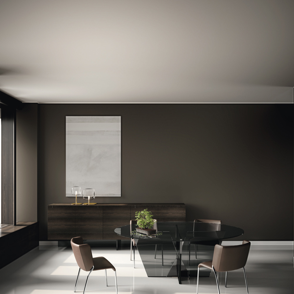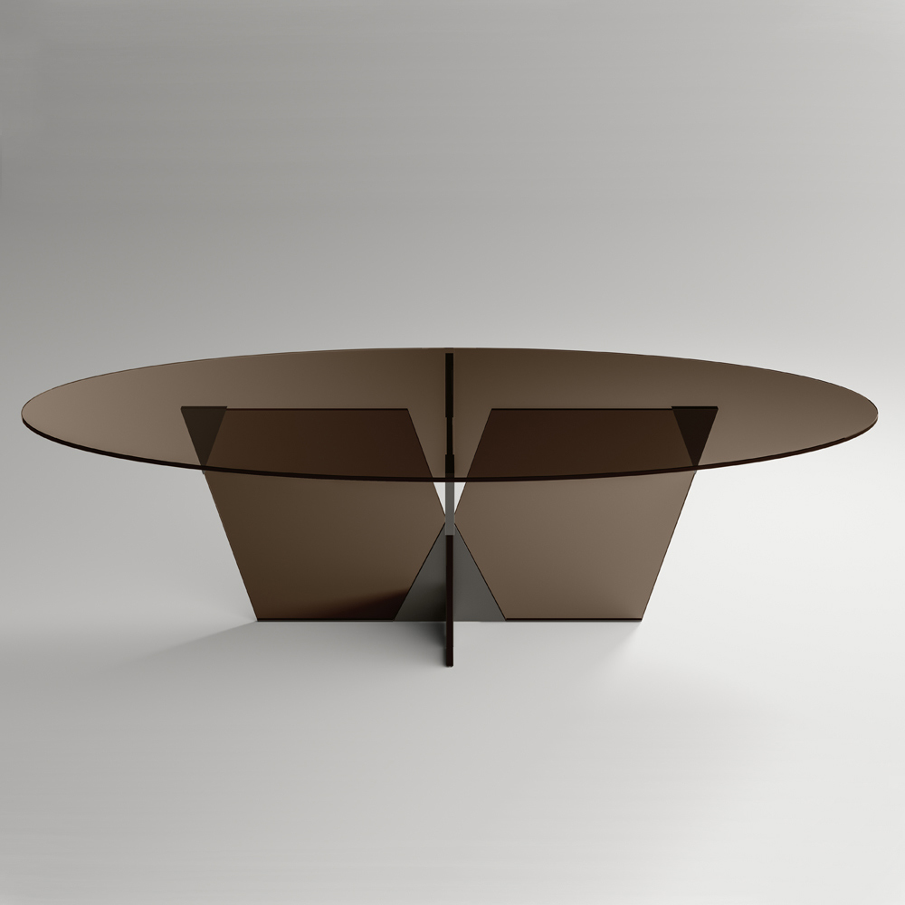 Table à manger fabriquée en Italie avec plateau ovale et base en verre. Le point fort de son esthétique est la base architecturale caractérisée par un joint pyramidal en métal qui constitue la partie essentielle du produit. Les éléments métalliques complètent le design de la table en donnant forme au verre de la base et en l'enrichissant de personnalité et d'originalité.
