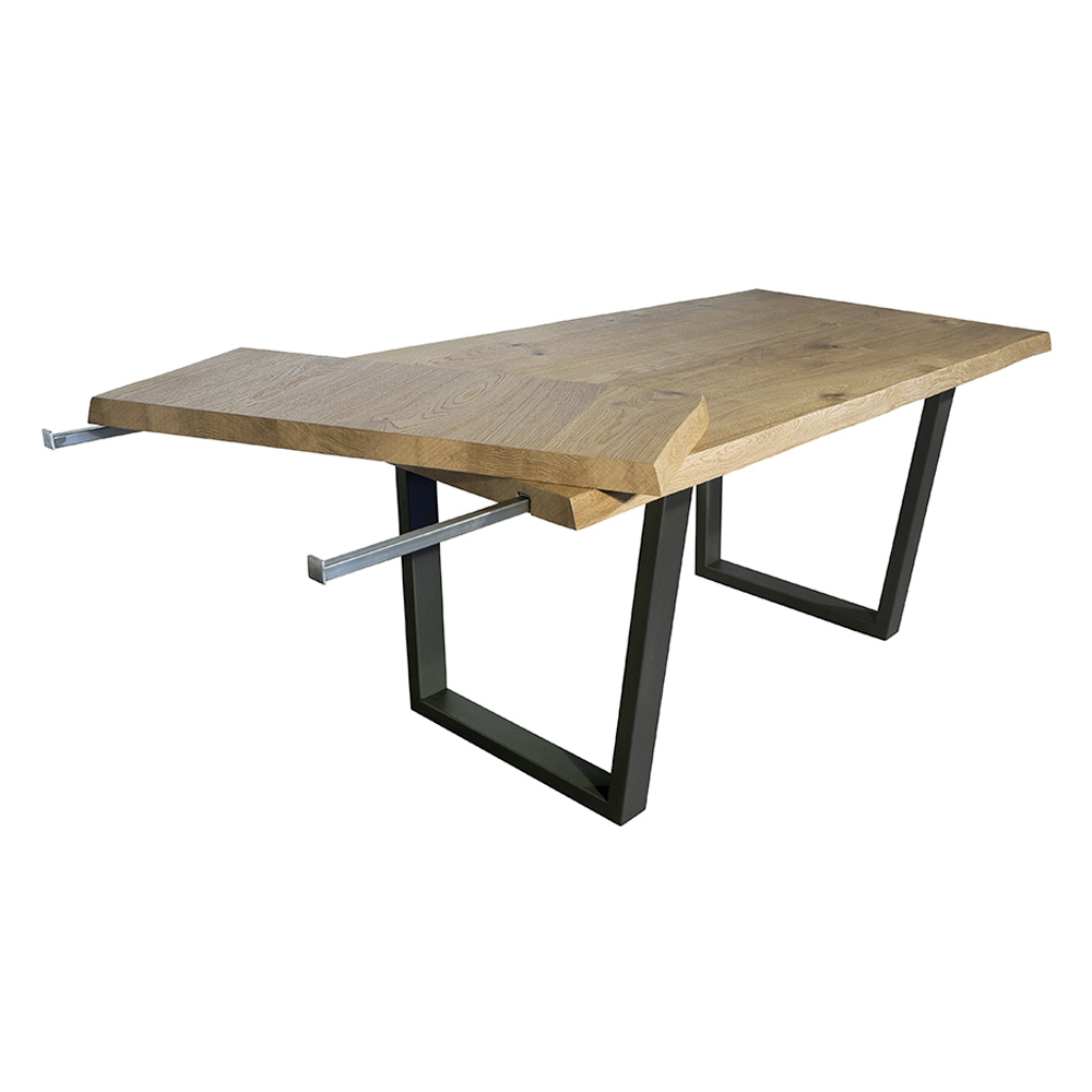 plaqué en chêne massif noué couleur scotch et son piètement est en métal gris fer. Cette table a été créée avec soin et passion pour célébrer l'unicité et la puissance de la nature, réalisée par des artisans italiens experts dans le secteur