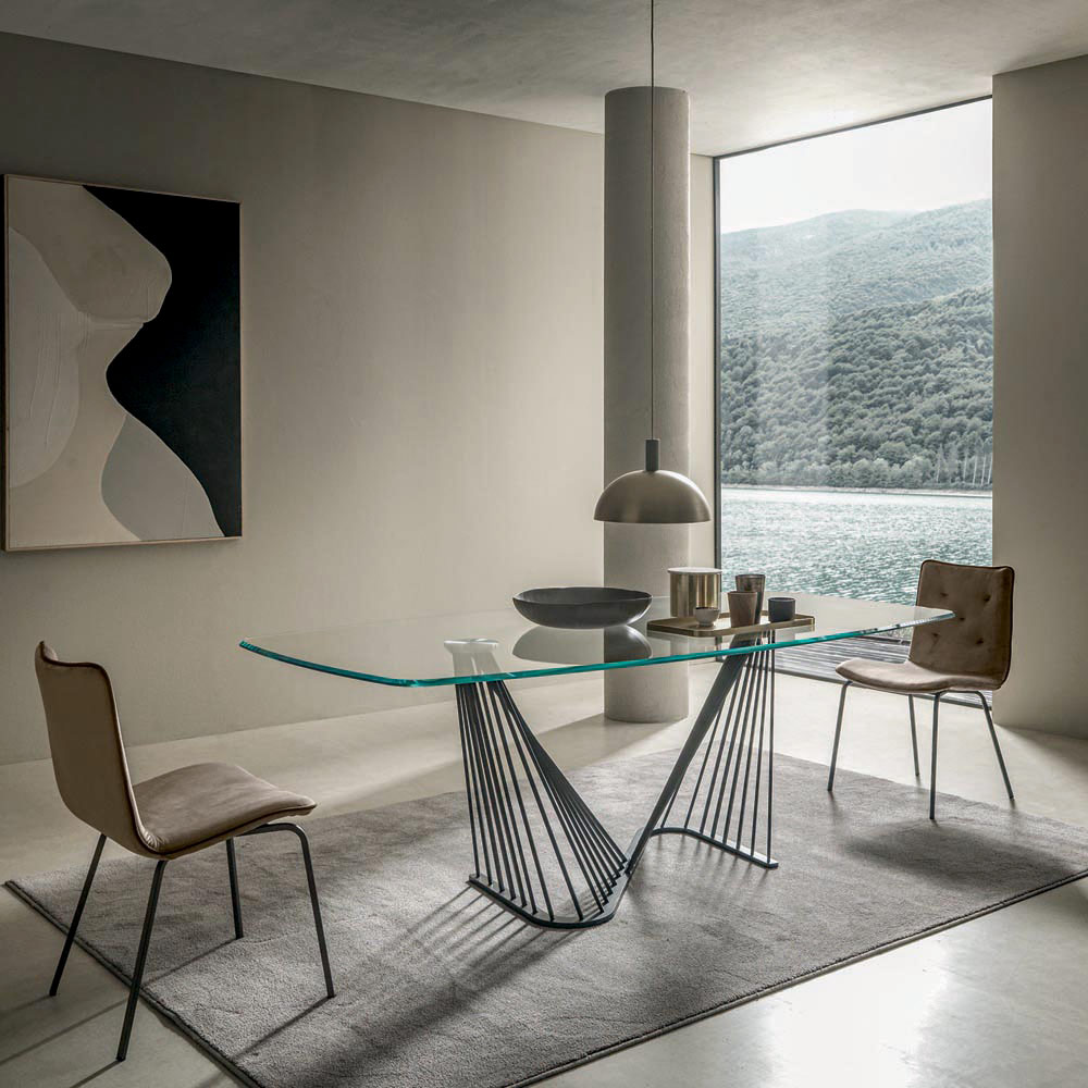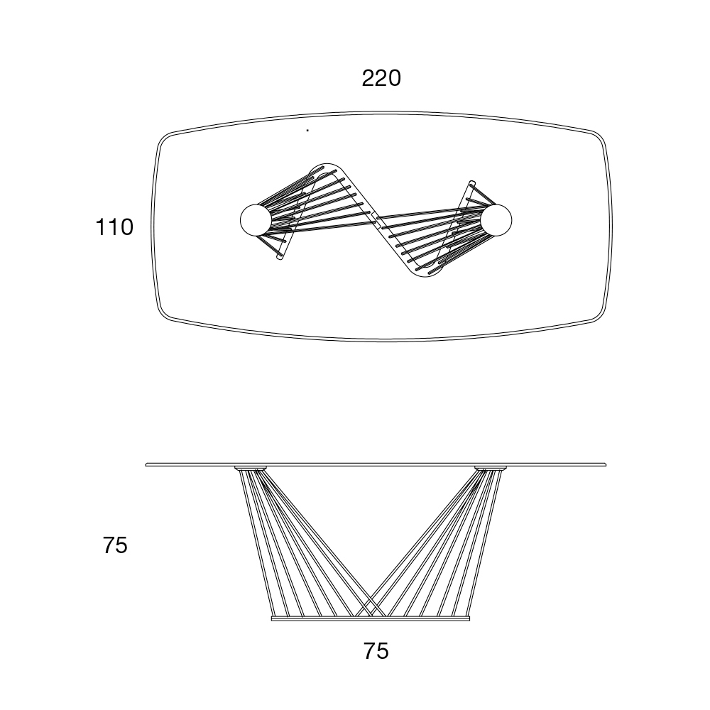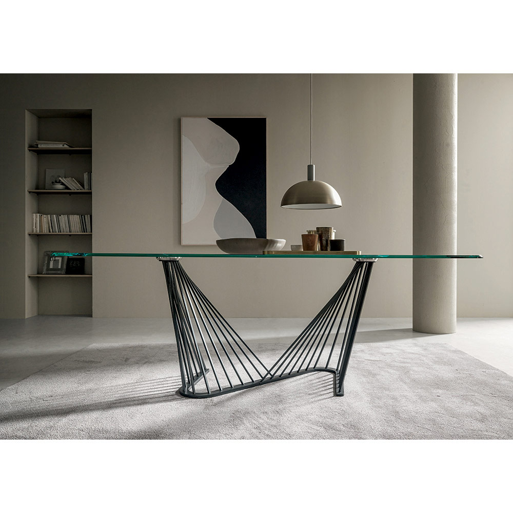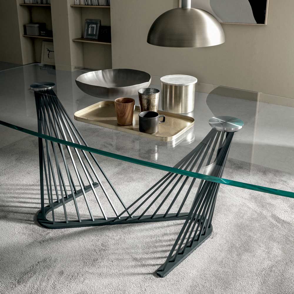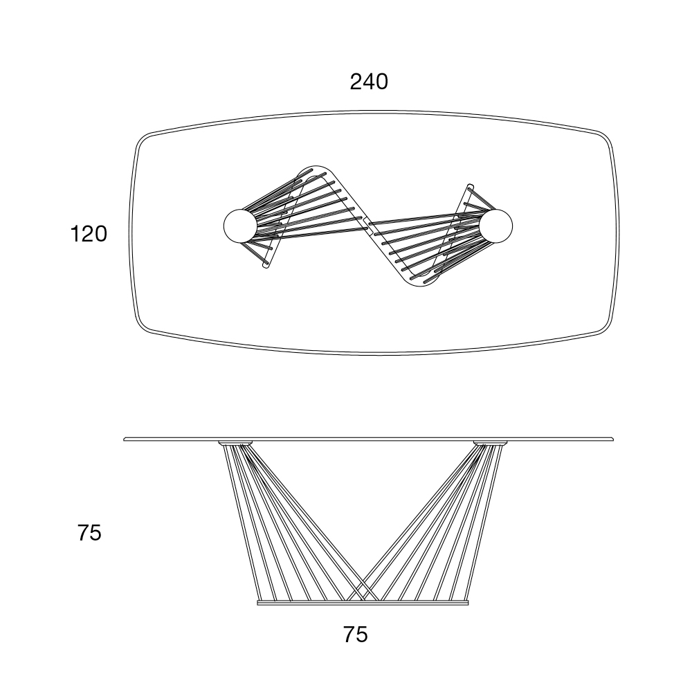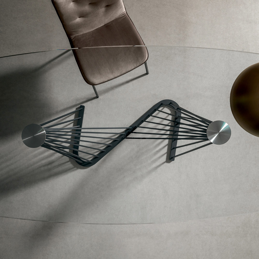 Cette table à manger a une structure avec une base en tige de métal carrée, revêtue de poudre en graphite gaufré et un plateau en forme de tonneau en verre trempé transparent extra-clair avec bord biseauté. Sa particularité est donnée par la structure composée d'une série de cordes métalliques de longueur inégale et tendues pour soutenir le plateau en verre. Son design aux lignes sinueuses et élégantes confère musicalité et élégance à l'environnement.