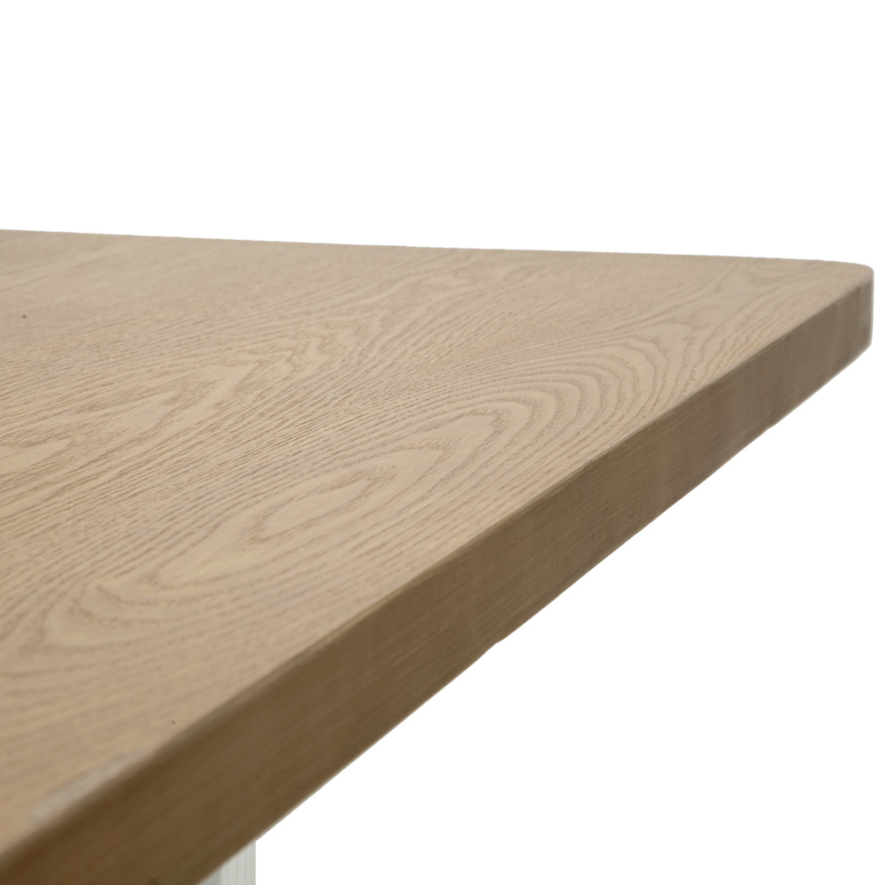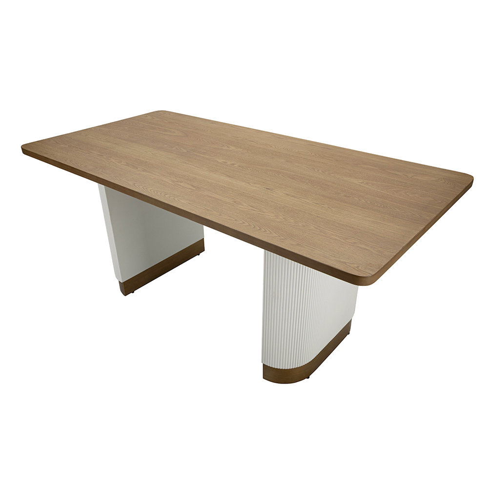 Cette table à manger est une synthèse impeccable de style et de fonctionnalité , un meuble conçu pour enrichir n'importe quel environnement avec sa présence discrète mais distinctive. La surface en MDF, aux tons naturels chauds, contraste harmonieusement avec la base blanche aux rainures verticales, offrant une texture visuelle raffinée et un design inspiré des éléments de l'architecture classique.