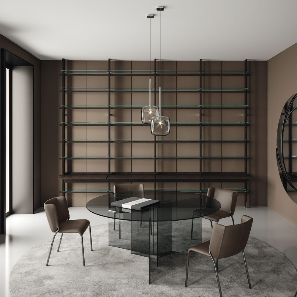 Table à manger entièrement en verre ultra-résistant avec plateau rond . Un complément au caractère raffiné issu d'un processus de production 100% Made in Italy grâce à des artisans qualifiés experts dans le traitement du verre, un matériau unique qui donne vie à une table design précieuse.