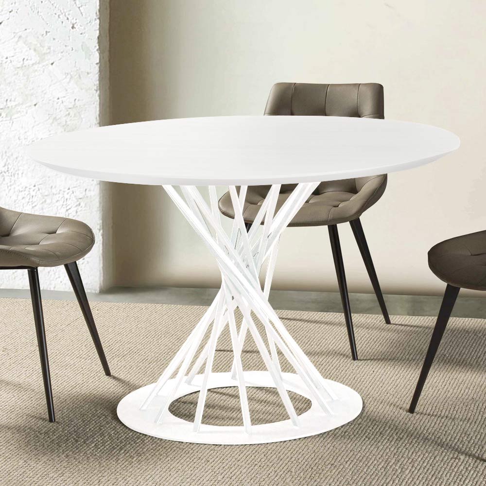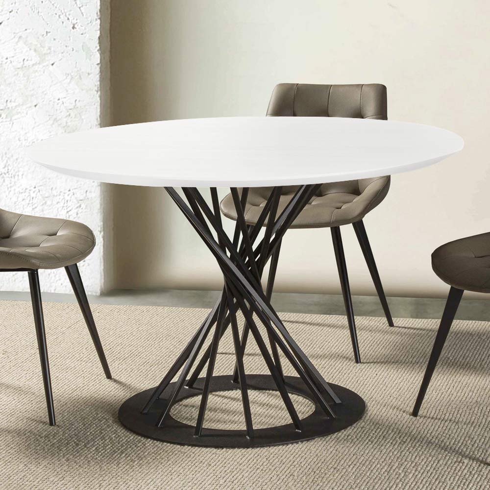 Table à manger ronde avec plateau en bois stratifié et base en acier, diamètre 120 cm.