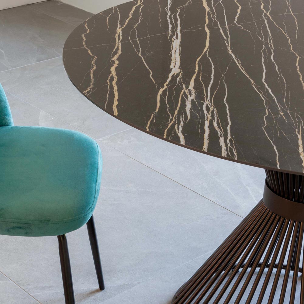 Table à manger ronde en céramique polie Florim et base en acier - Denali