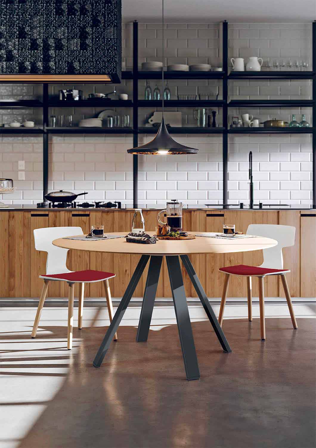 Cette table de salle à manger se caractérise par une structure en métal peint en blanc ou noir composée de 4 pieds disposés dans un motif sunburst qui permettent stabilité et robustesse . La base permet également à la table d'acquérir élégance et polyvalence, ce qui la rend facilement combinable avec n'importe quel style de mobilier. Le plateau est en MDF couleur chêne et est disponible en 2 diamètres différents pour s'adapter parfaitement à chaque besoin.
