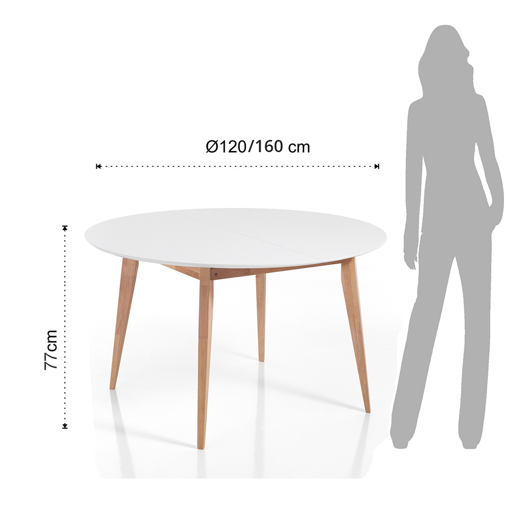 Table à manger avec plateau rond extensible en mdf laqué blanc mat (épaisseur 3 cm) et pieds en bois massif finition chêne blanchi . Un produit au design simple et épuré, idéal pour ceux qui aiment un style de mobilier essentiel et polyvalent capable de compléter le style de leur salle à manger ou de leur cuisine avec goût et personnalité. Son point fort est représenté par le plateau extensible qui, grâce à une extension de 40 cm chacun, atteint une longueur de 160 cm.