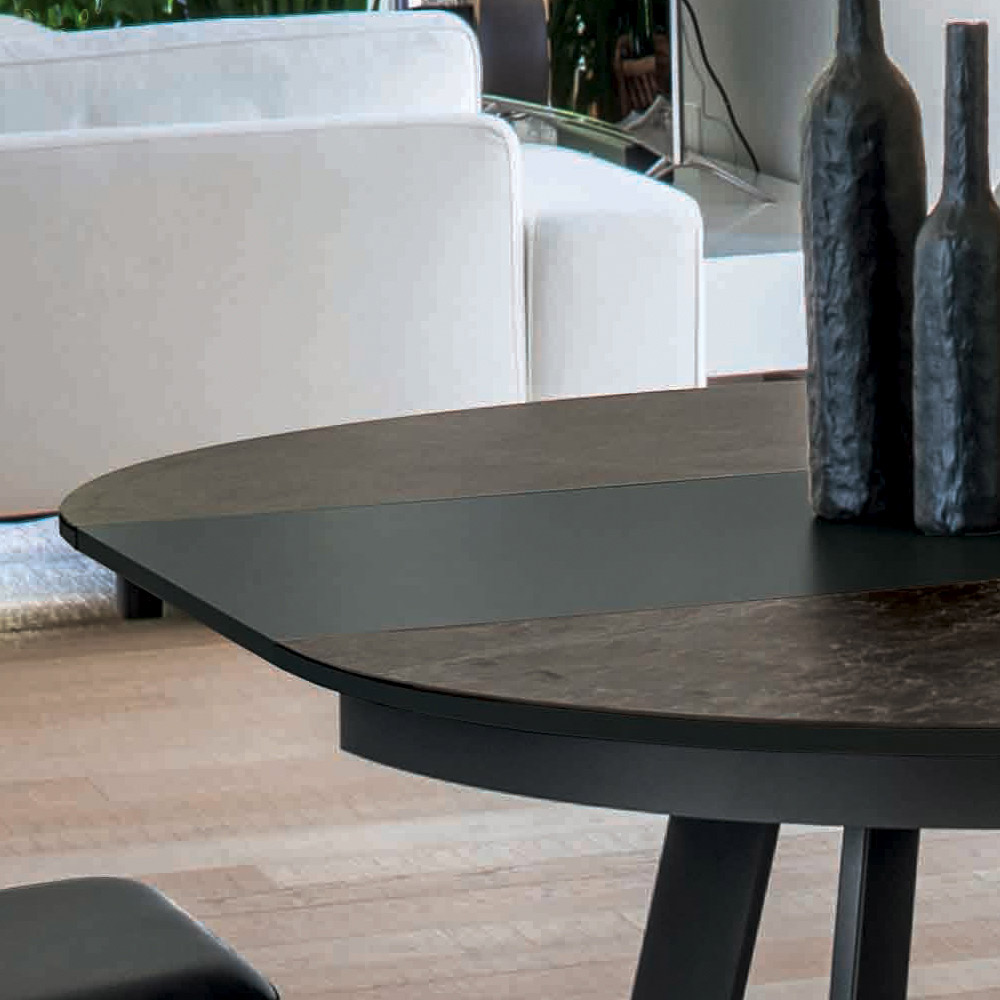 Table à manger réalisée par une production artisanale 100% Made in Italy avec structure en métal verni graphite gaufré et plateau rond en céramique divisé en deux demi-plans pour accueillir les 3 rallonges externes, augmentant ainsi la surface et les possibilités de convivialité.