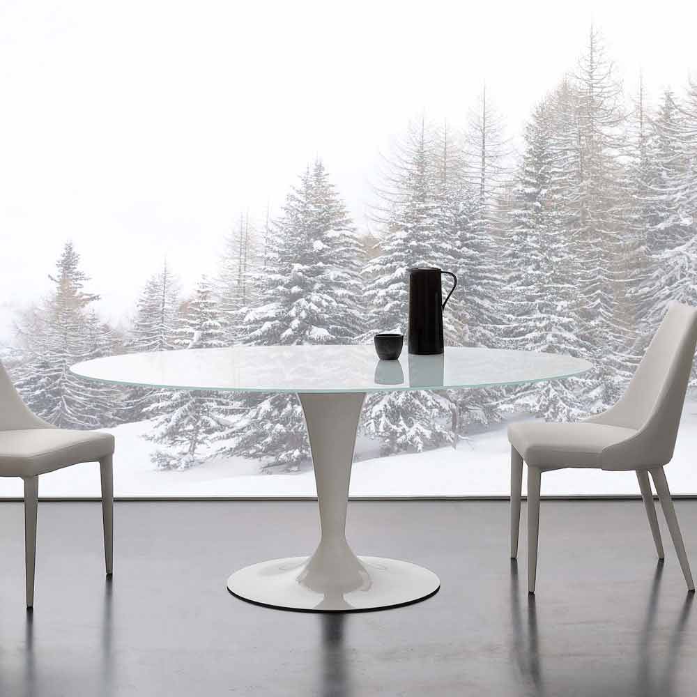 Piétement en acier peint en blanc et plateau en verre trempé extrawhite d'épaisseur 10 mm.