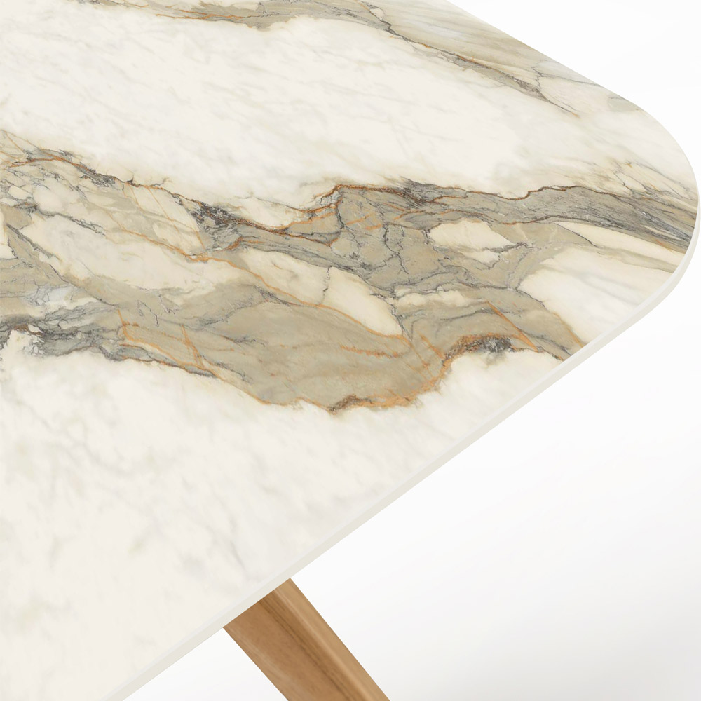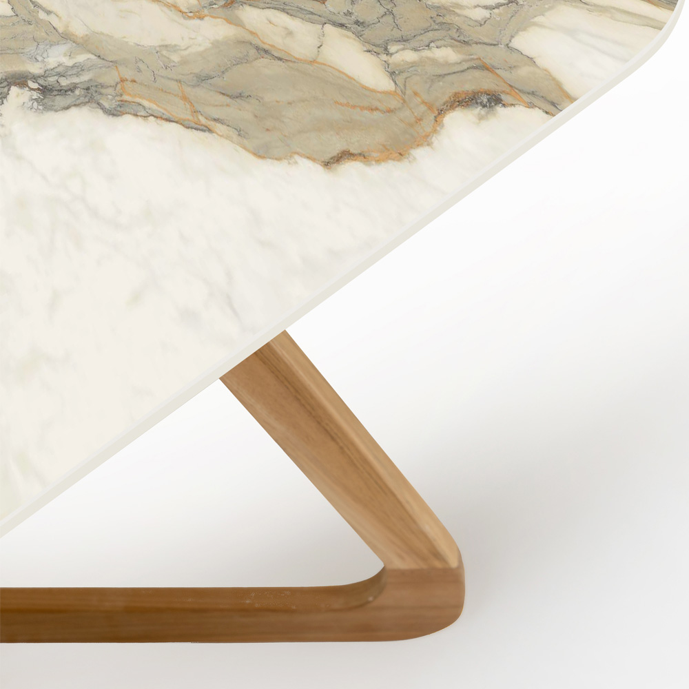 Made in Italy. Cette table d'extérieur est un chef-d'œuvre de design alliant l'art de la céramique au savoir-faire du bois. Son plateau en céramique s'inspire du prestigieux marbre Calacatta Hermitage , réputé pour ses veinures gris-vert complexes sur fond blanc crème, ajoutant une touche de luxe et de sophistication à tout espace extérieur.