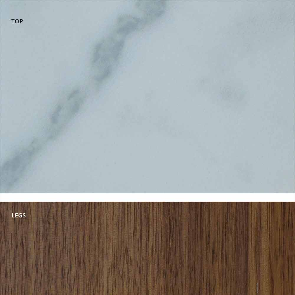 - base composée de plus de 70 lattes en bois de frêne huilé en couleur noyer, et d'un plateau en forme de tonneau en grès opaque marbré blanc.