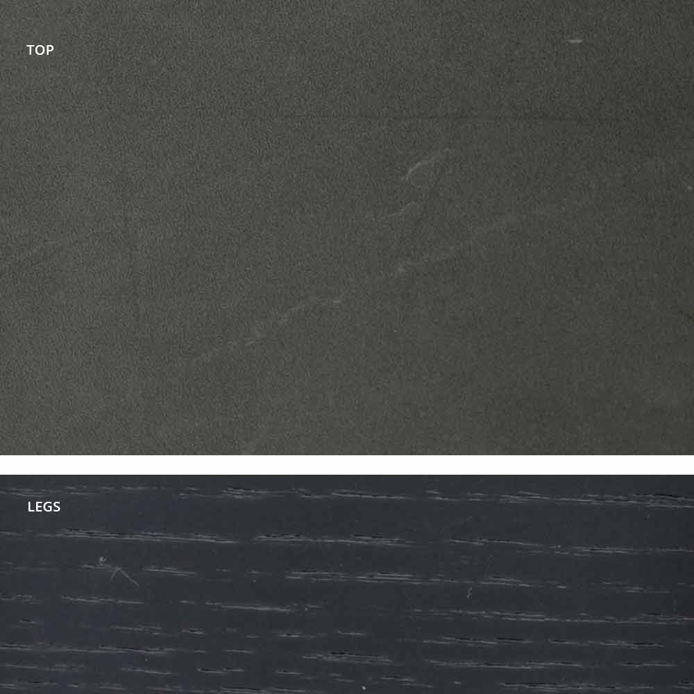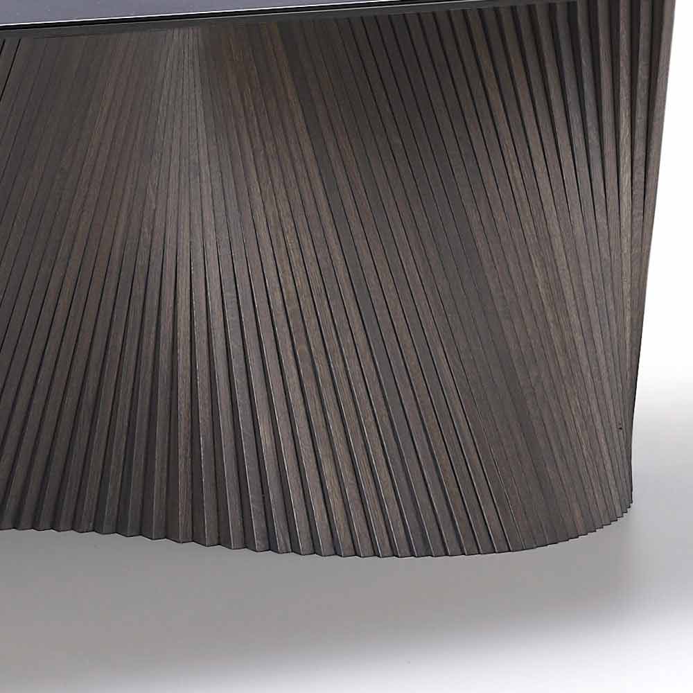 - base constituée de plus de 70 lattes de frêne gris noir huilé à la main et d'un plateau en forme de tonneau en grès opaque effet marbre;
