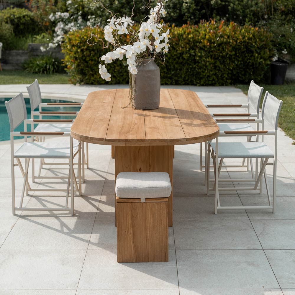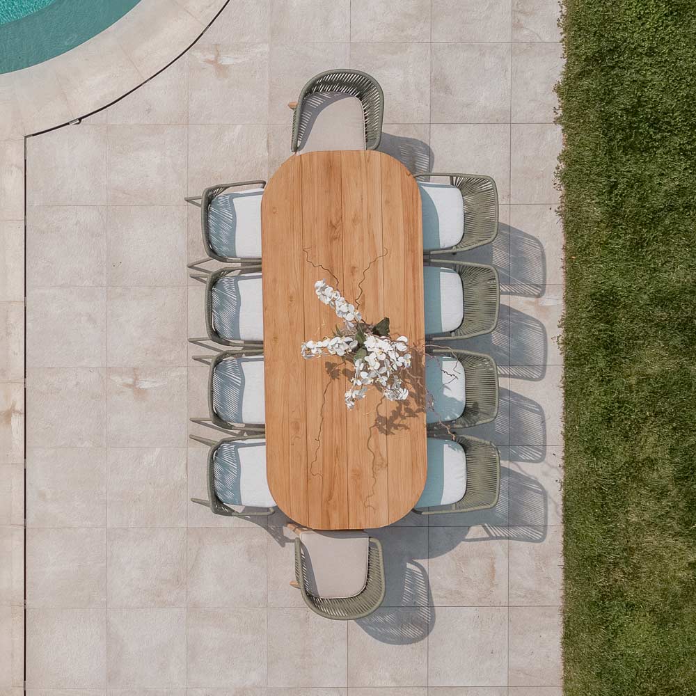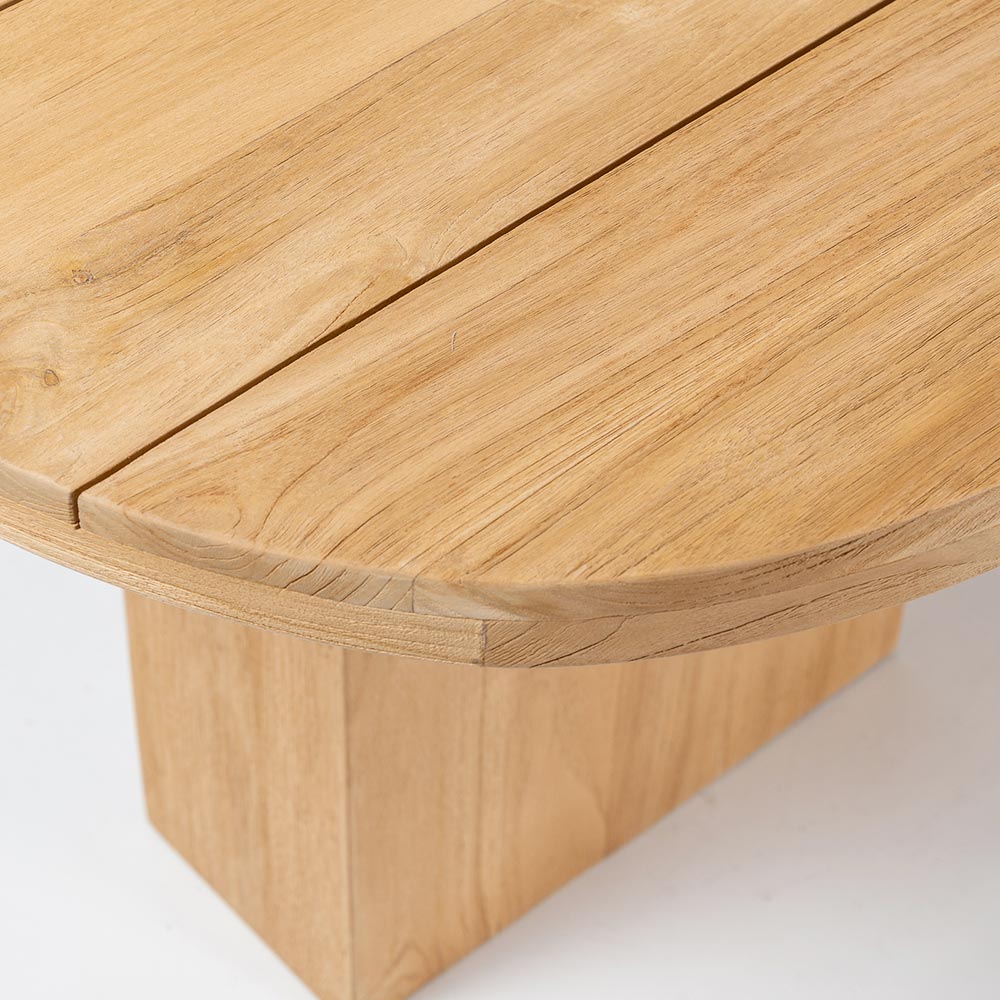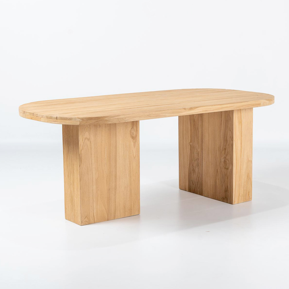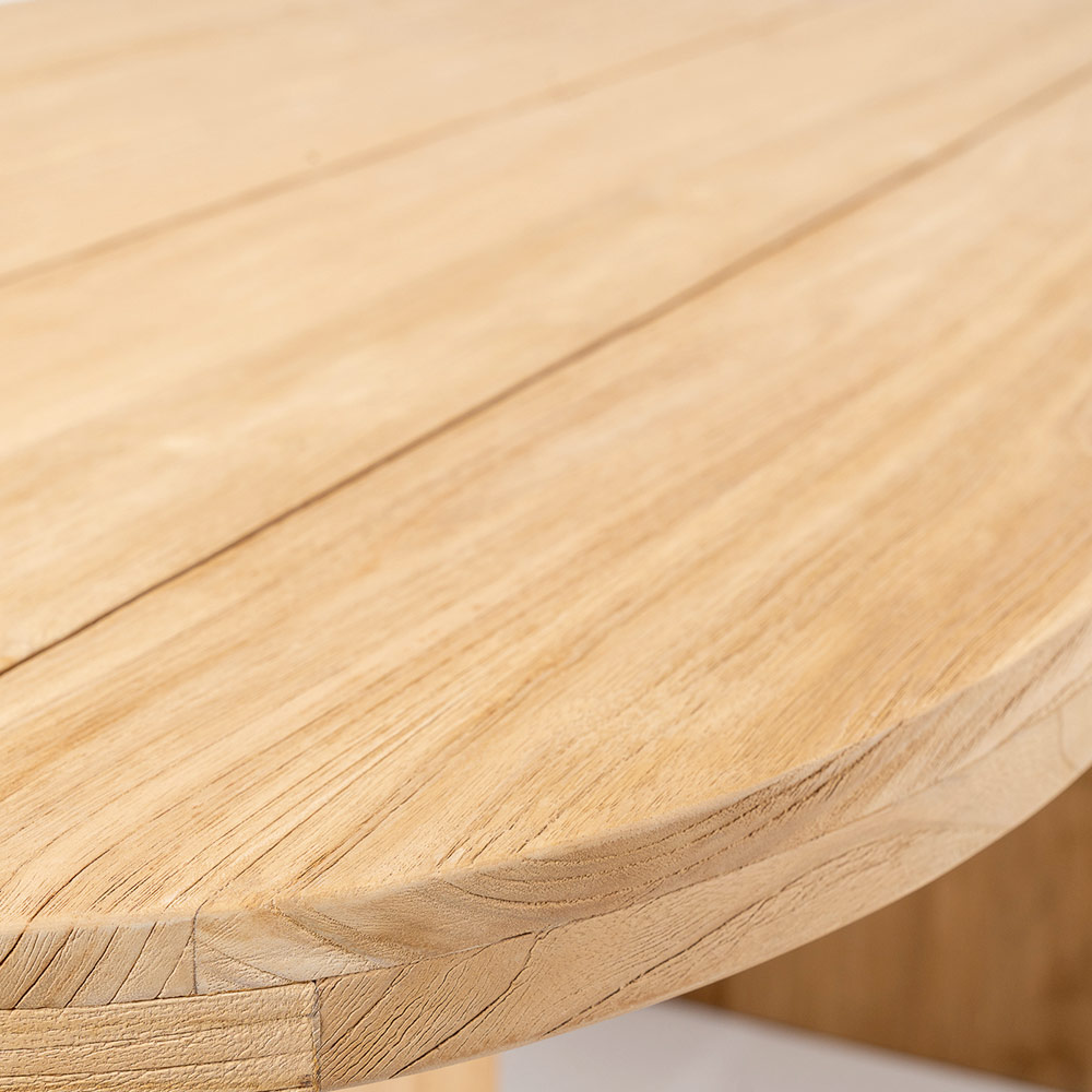 Table avec plateau en teck brossé, lattes longitudinales et angles arrondis.