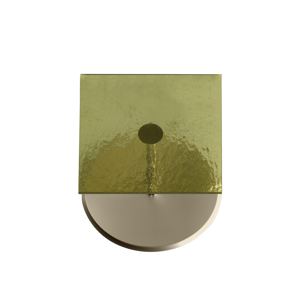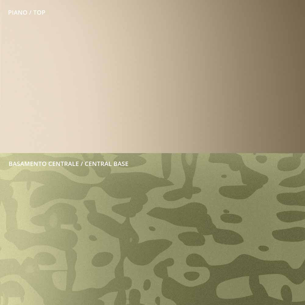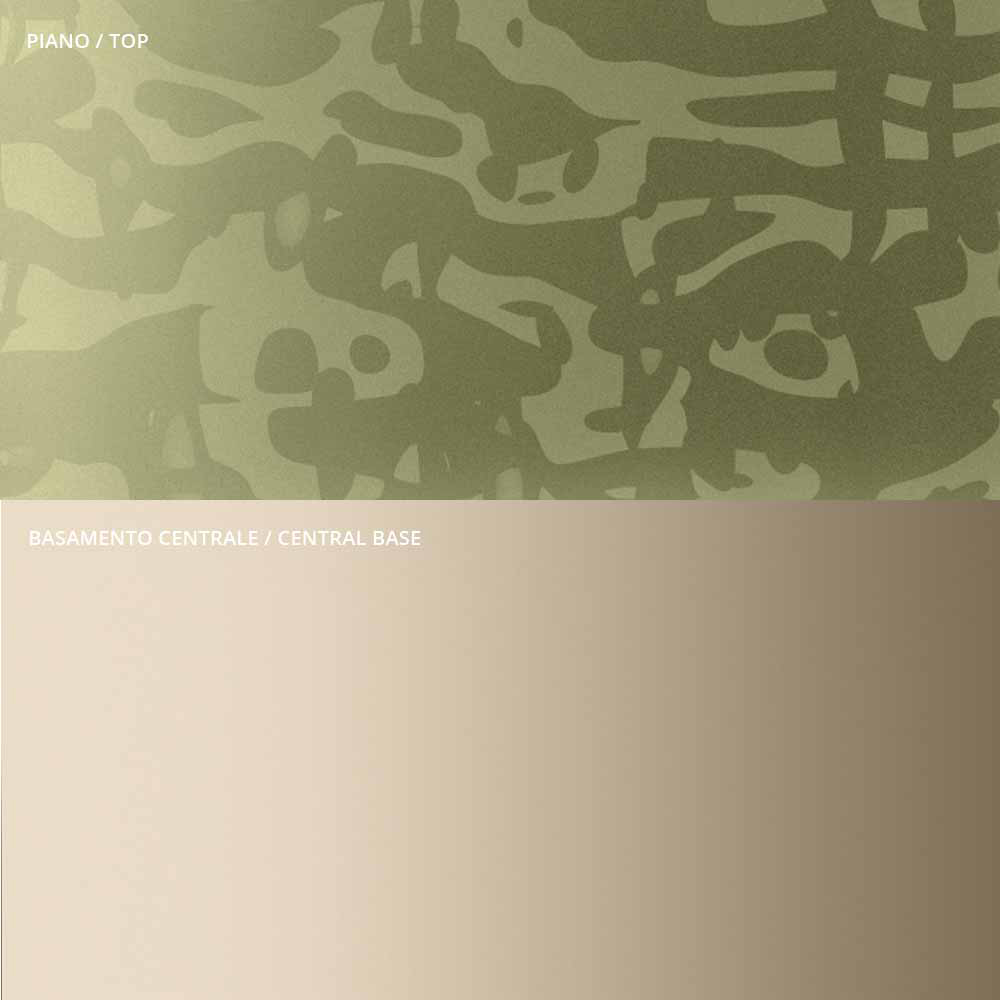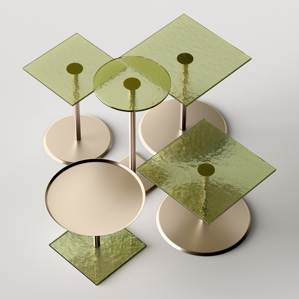 Table basse réalisée soit avec un plateau en verre fusionné et une base en métal avec un profil façonné, soit avec un plateau en métal avec un profil façonné et une base en verre fusionné Made in Italy. La tige centrale est toujours en métal avec une finition métallisée champagne.