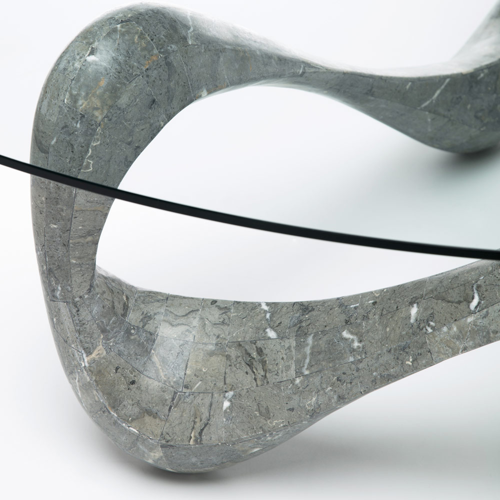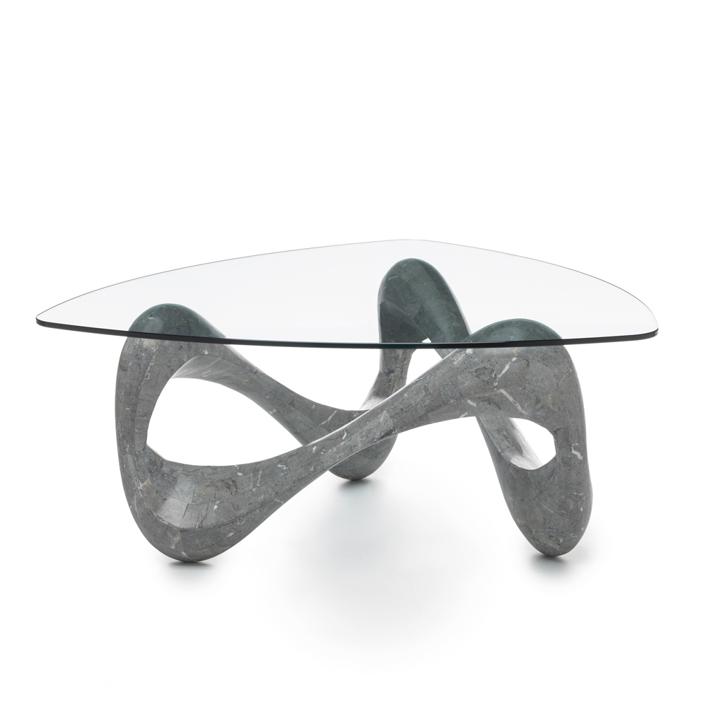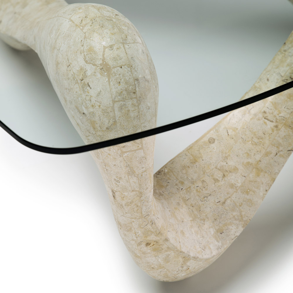 La table basse California montre le savoir-faire d'artisans experts dans le travail de la pierrefossile , afin de lui donner les formes les plus disparates.
