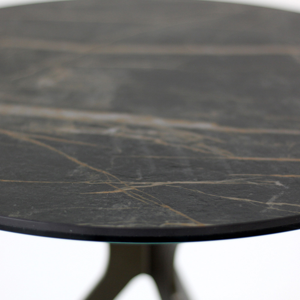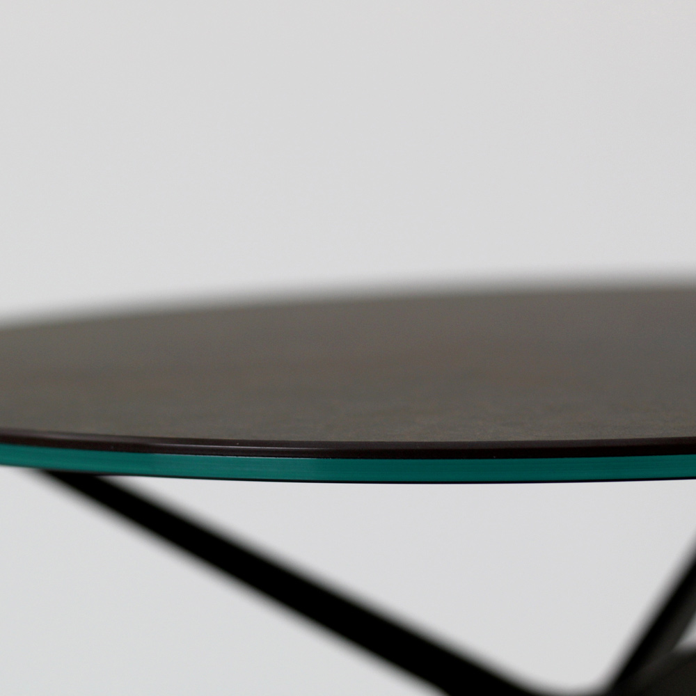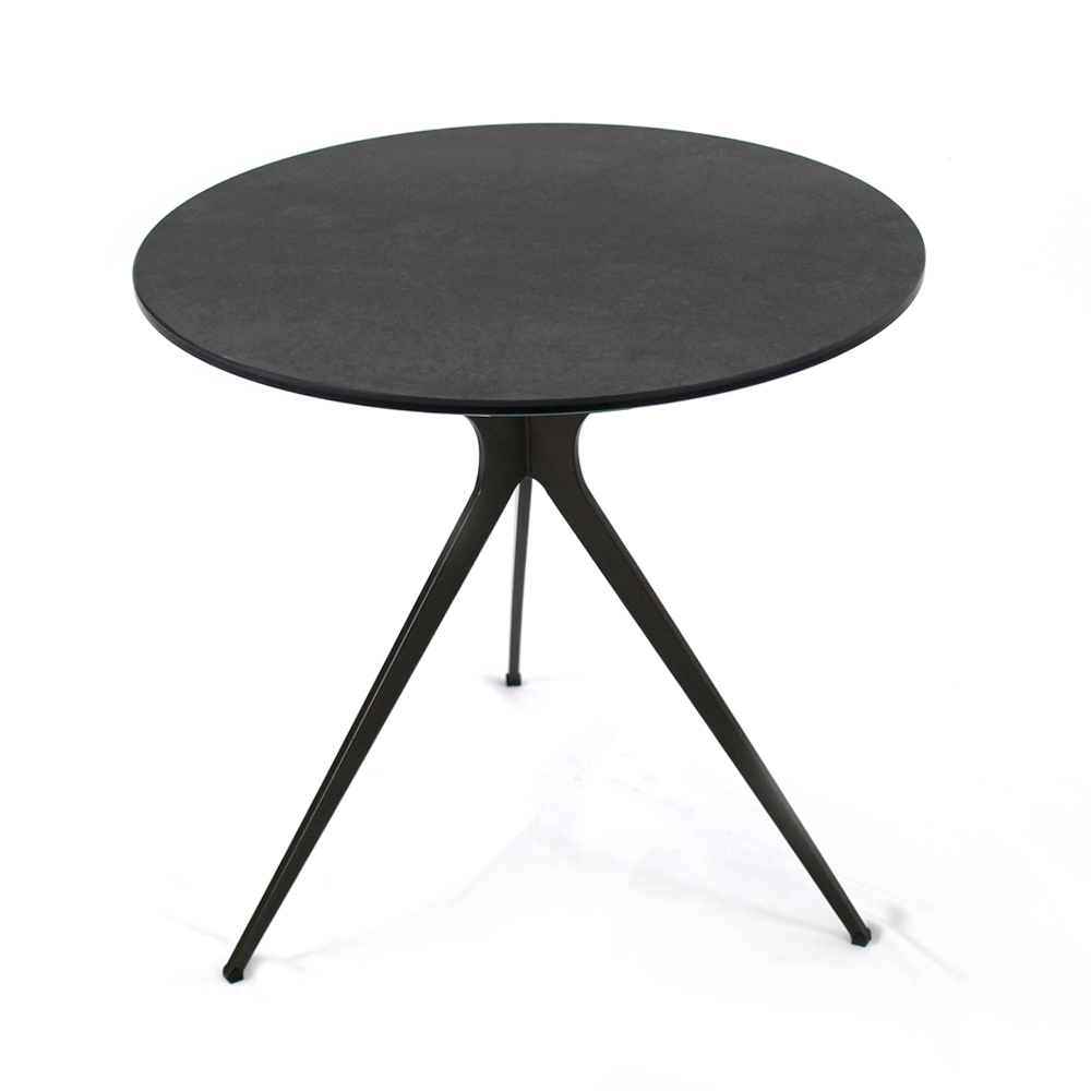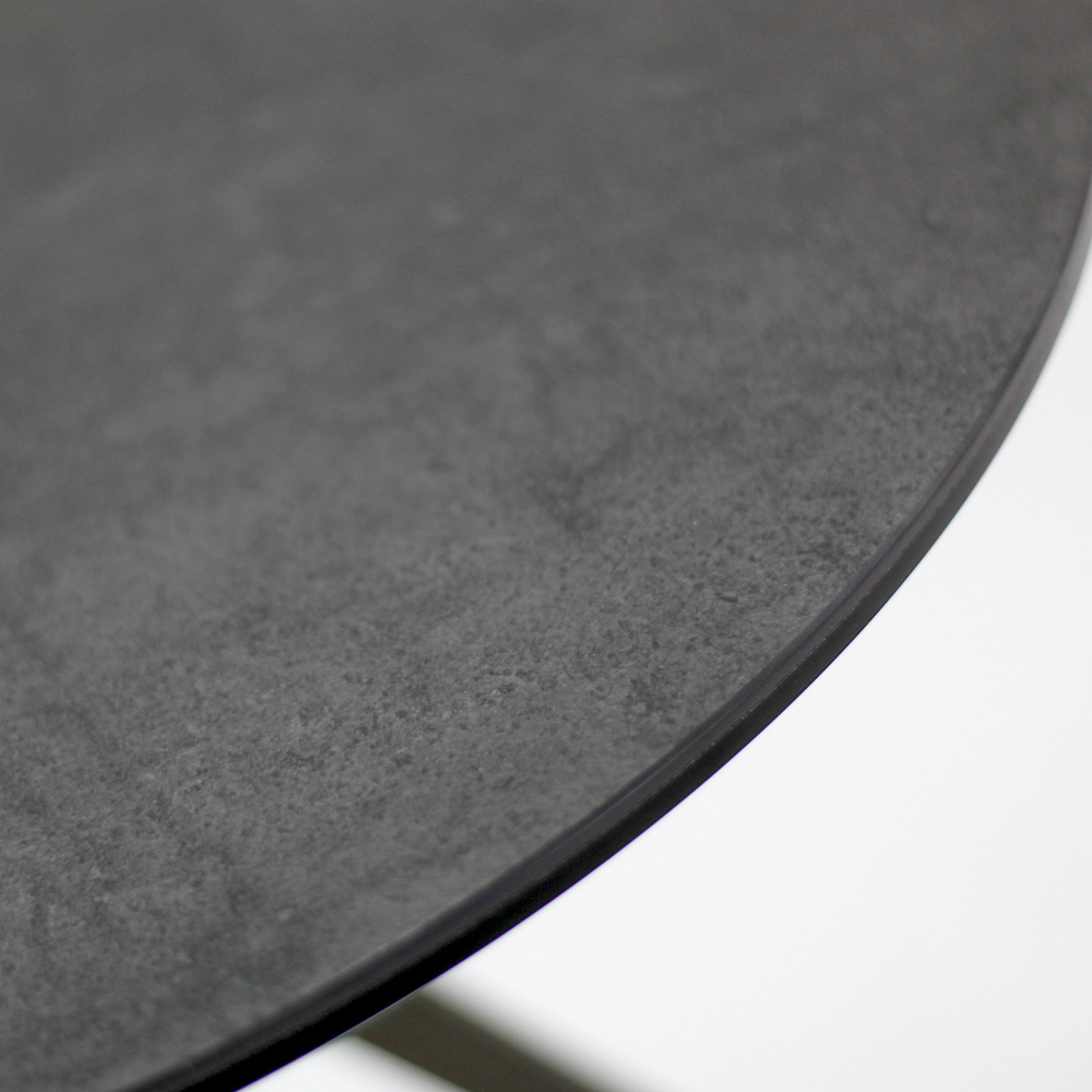 Table basse ronde avec base en acier peint et plateau en grès cérame.