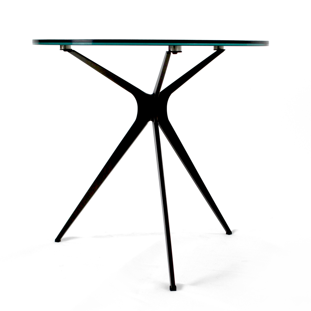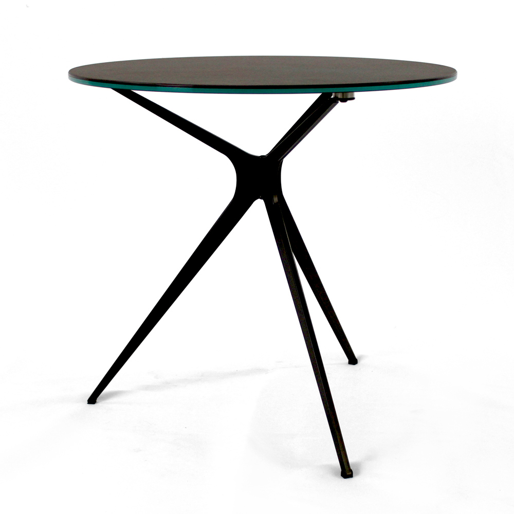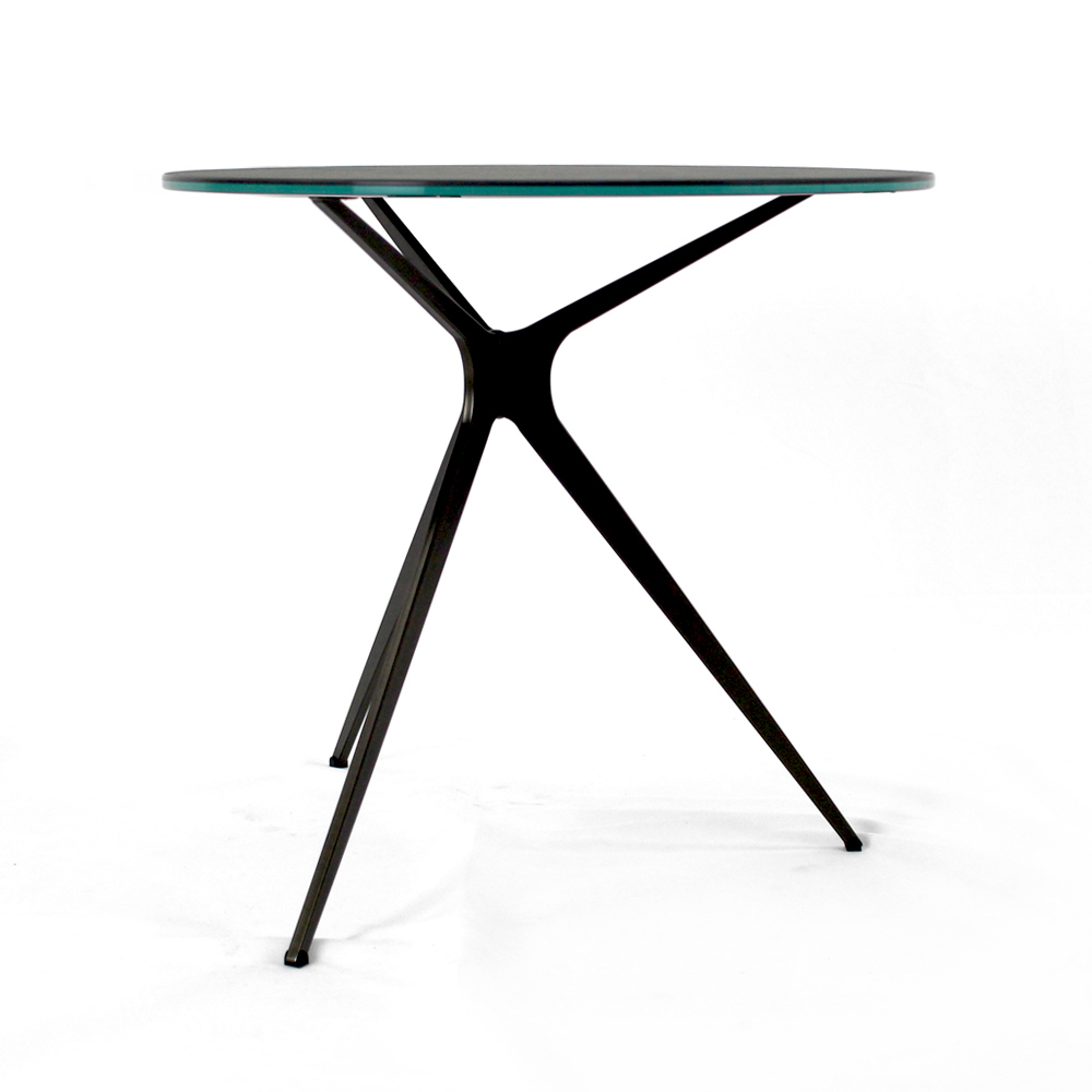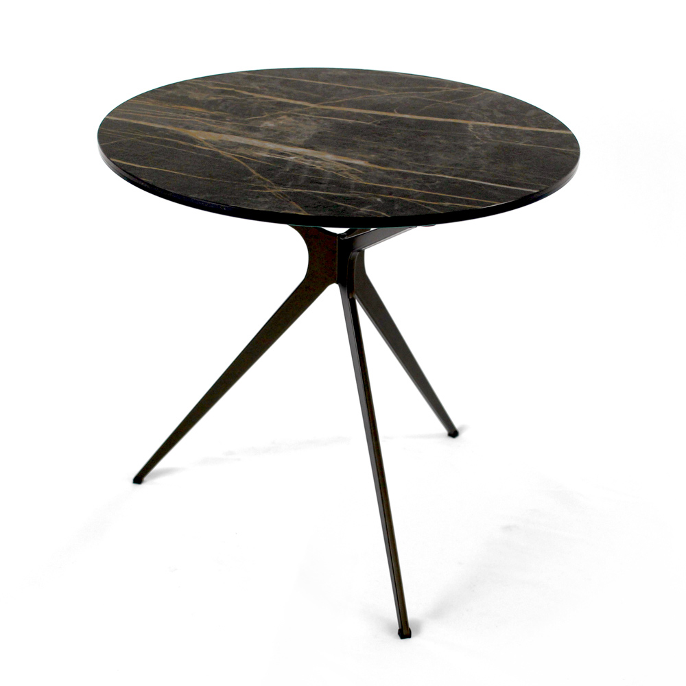 Table basse ronde avec base en acier peint et plateau en grès cérame.