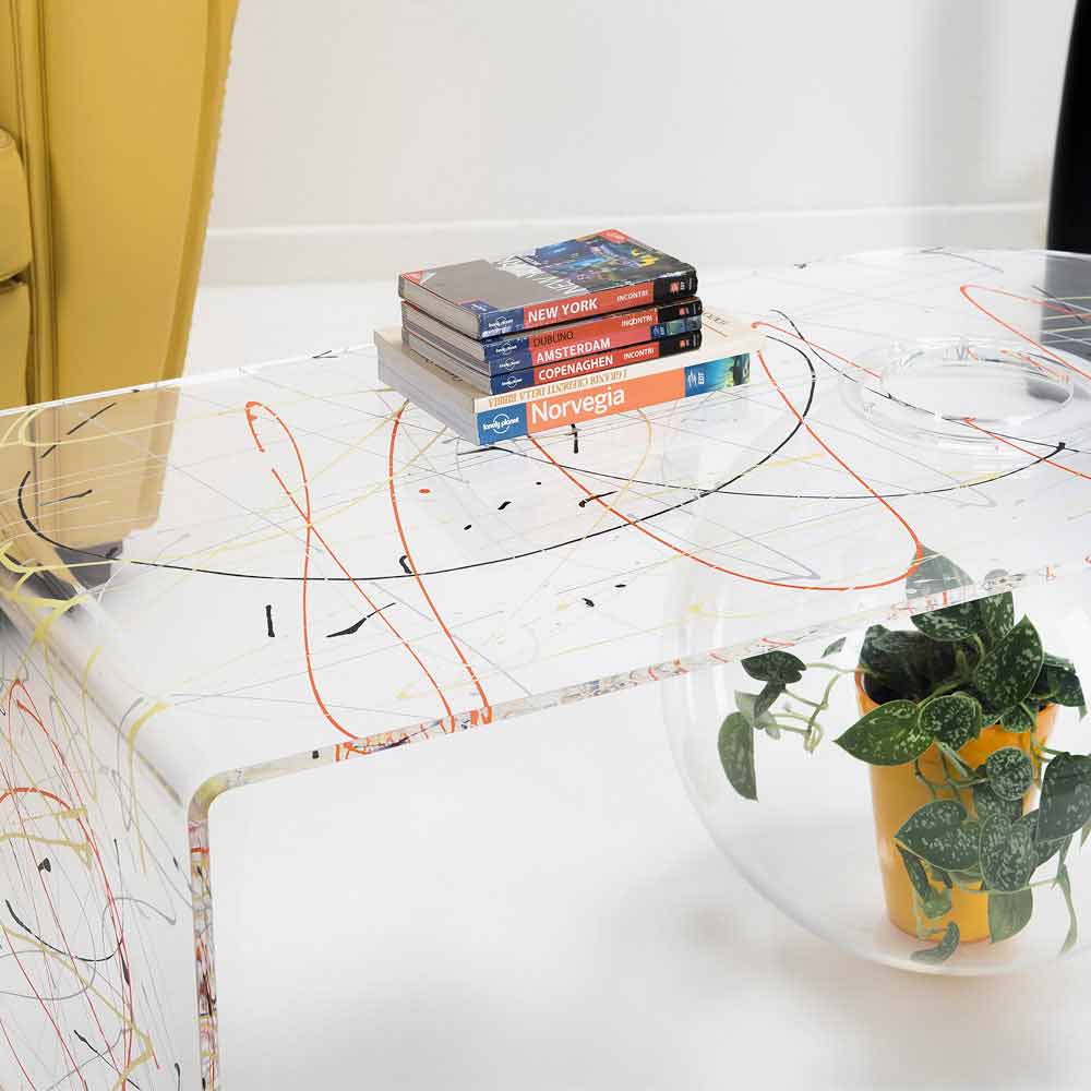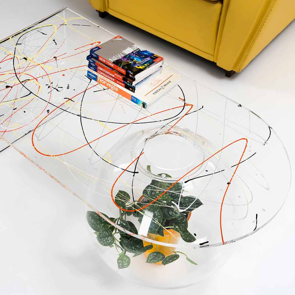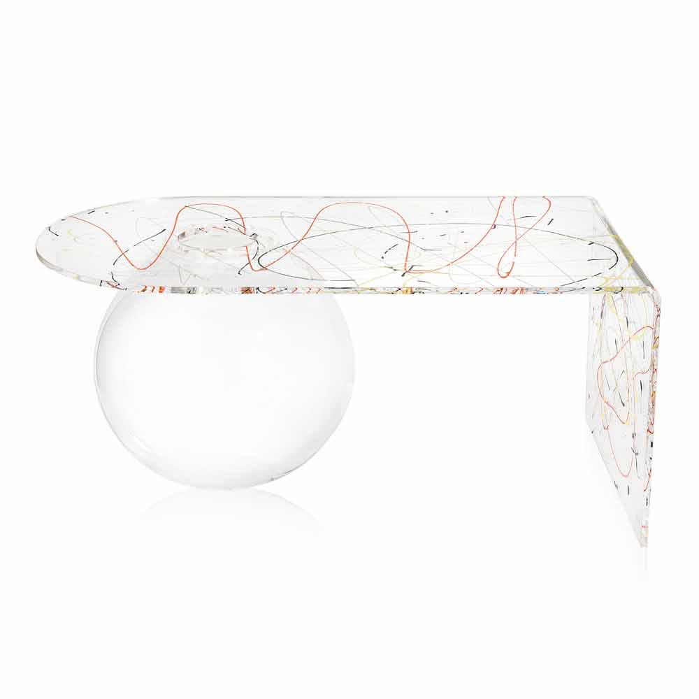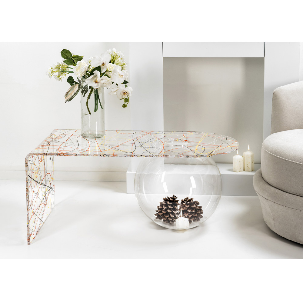 Table basse de salon en plexiglas Bolly, fabriquée en Italie Bolly est une table courbe fabriquée à la main en Italie en plexiglas 100% polymère vierge, découpée au laser, thermoformée à haute température et assemblée à une structure sphérique pouvant être utilisée comme vase à fleurs, aquarium ou tout simplement comme contenant.