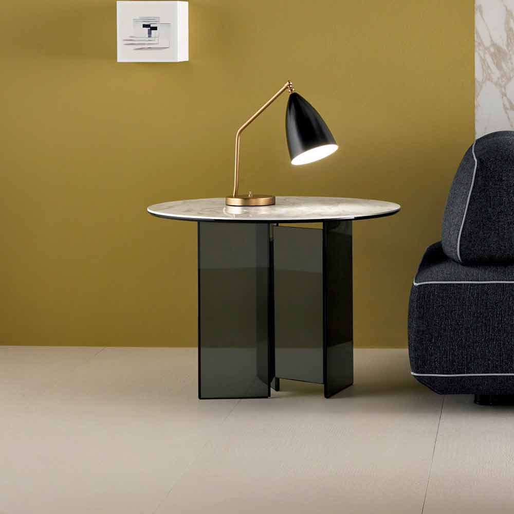 Fabriqué en verre fumé pour la base et un plateau en céramique calacatta polie arabesque , c'est un meuble fabriqué à la main en Italie avec des matériaux de haute qualité, idéal pour le salon.