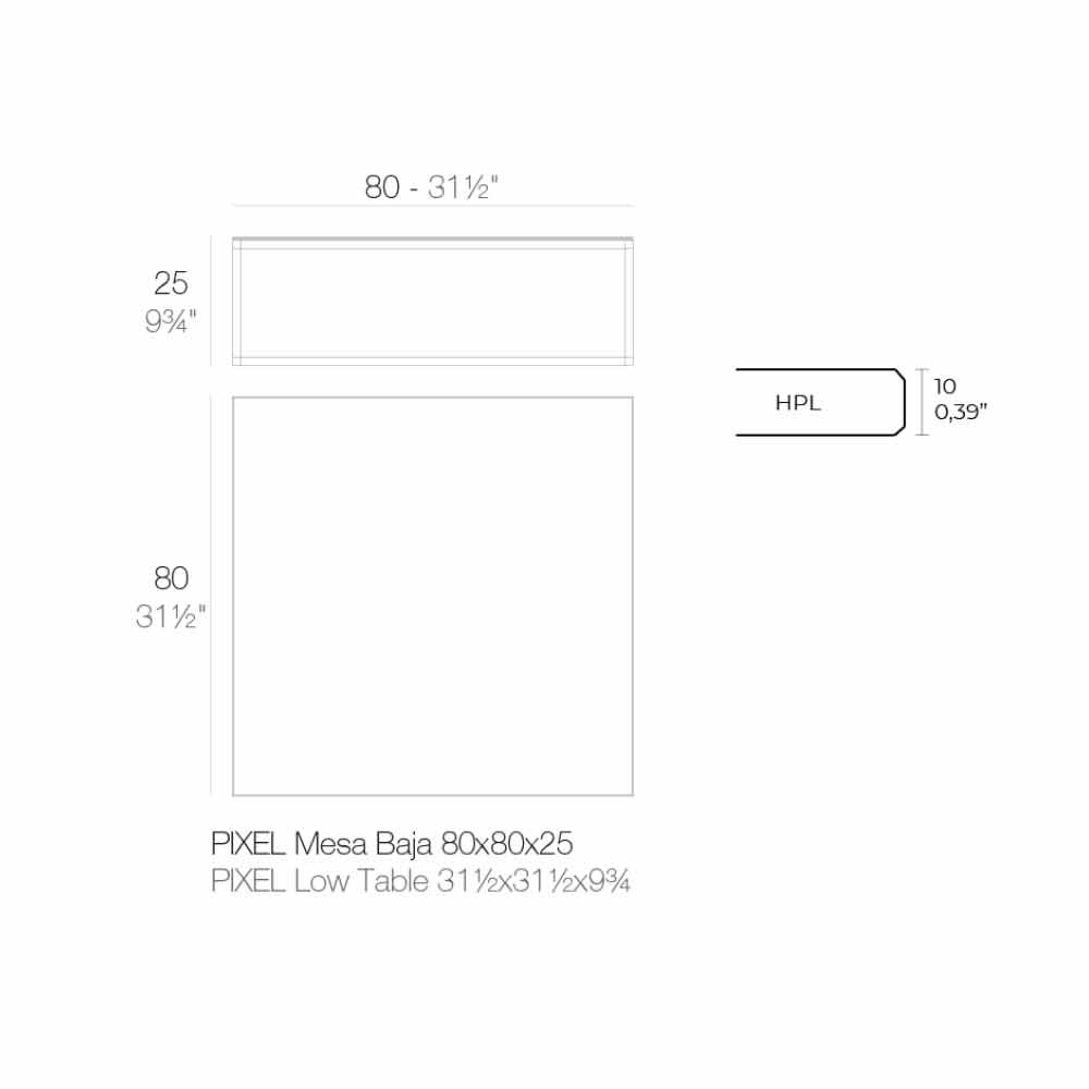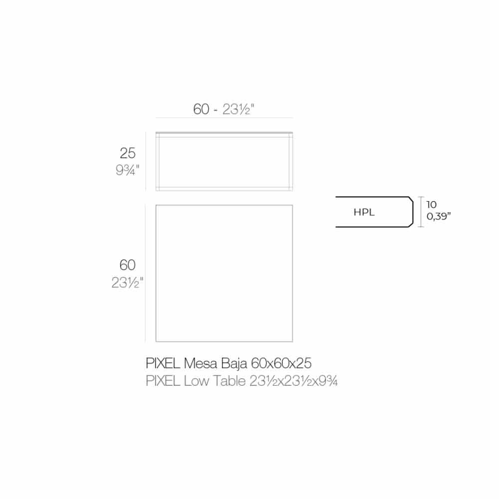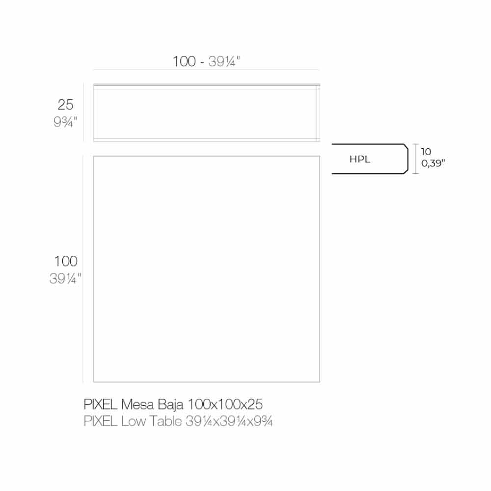 Table basse design carrée pour le salon de jardin en aluminium et plateau en HPL noir, 4 tailles et 2 hauteurs.