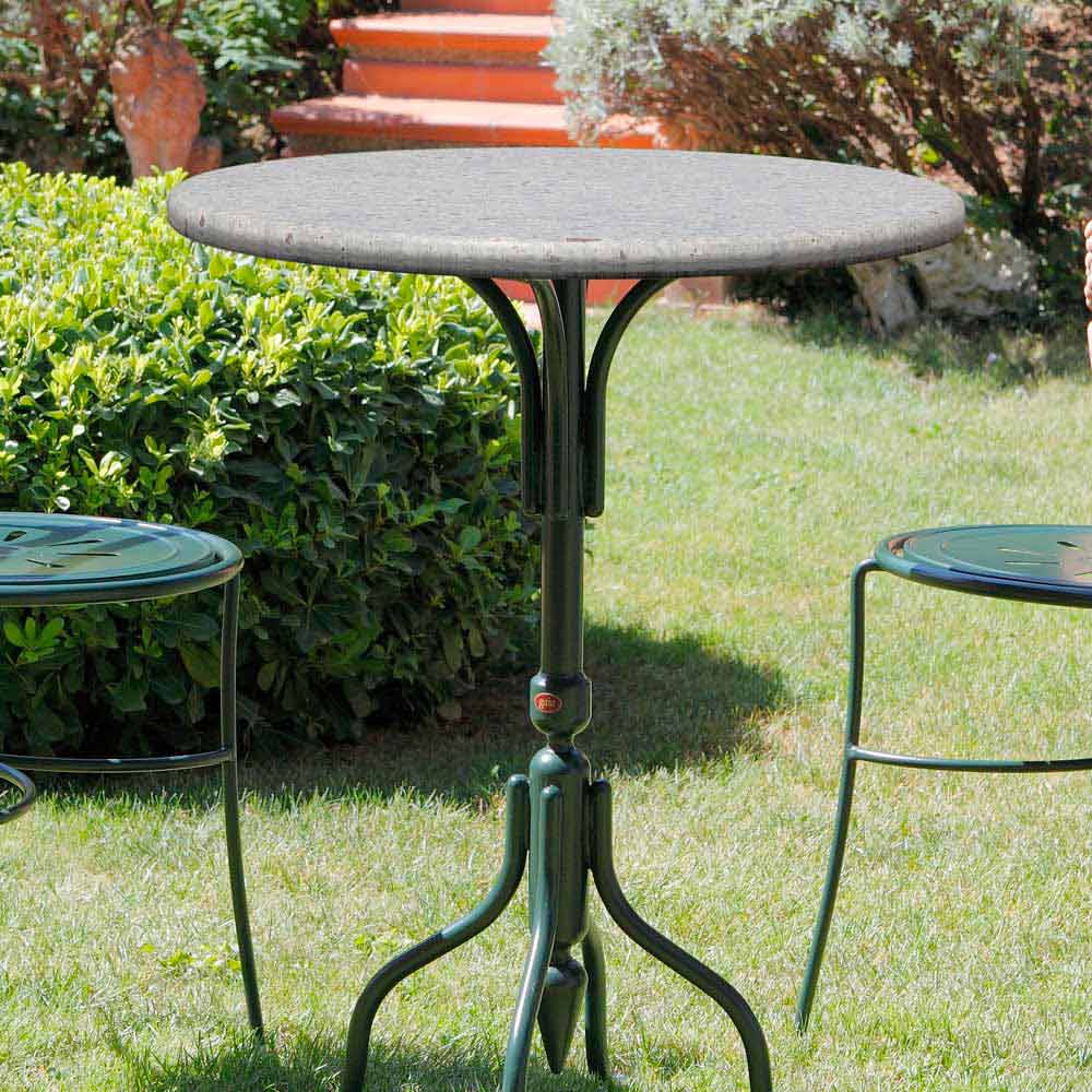 Table basse d'extérieur ronde en pierre avec base en fer fait à la main Made in Italy.