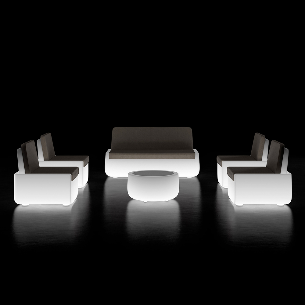Table basse d'extérieur design basse en polyéthylène avec plateau en HPL et éclairage LED Made in Italy.