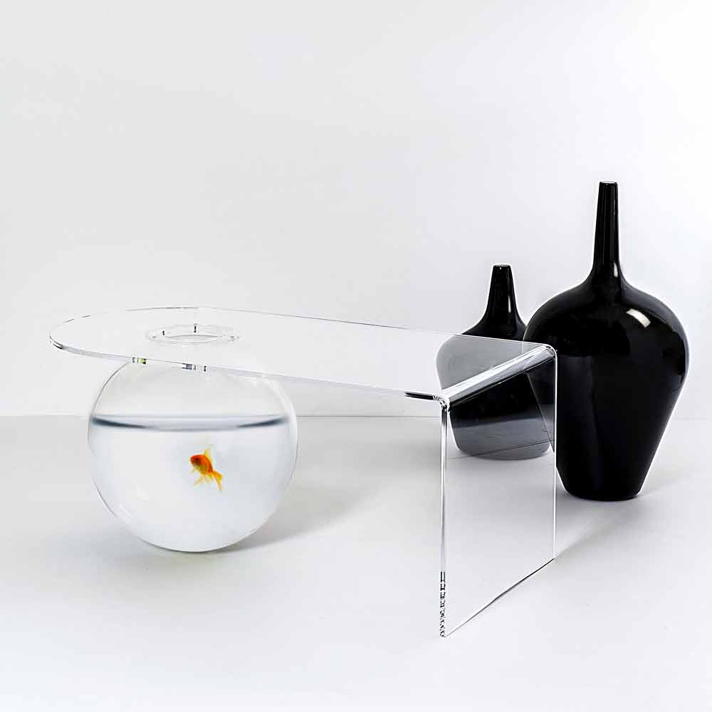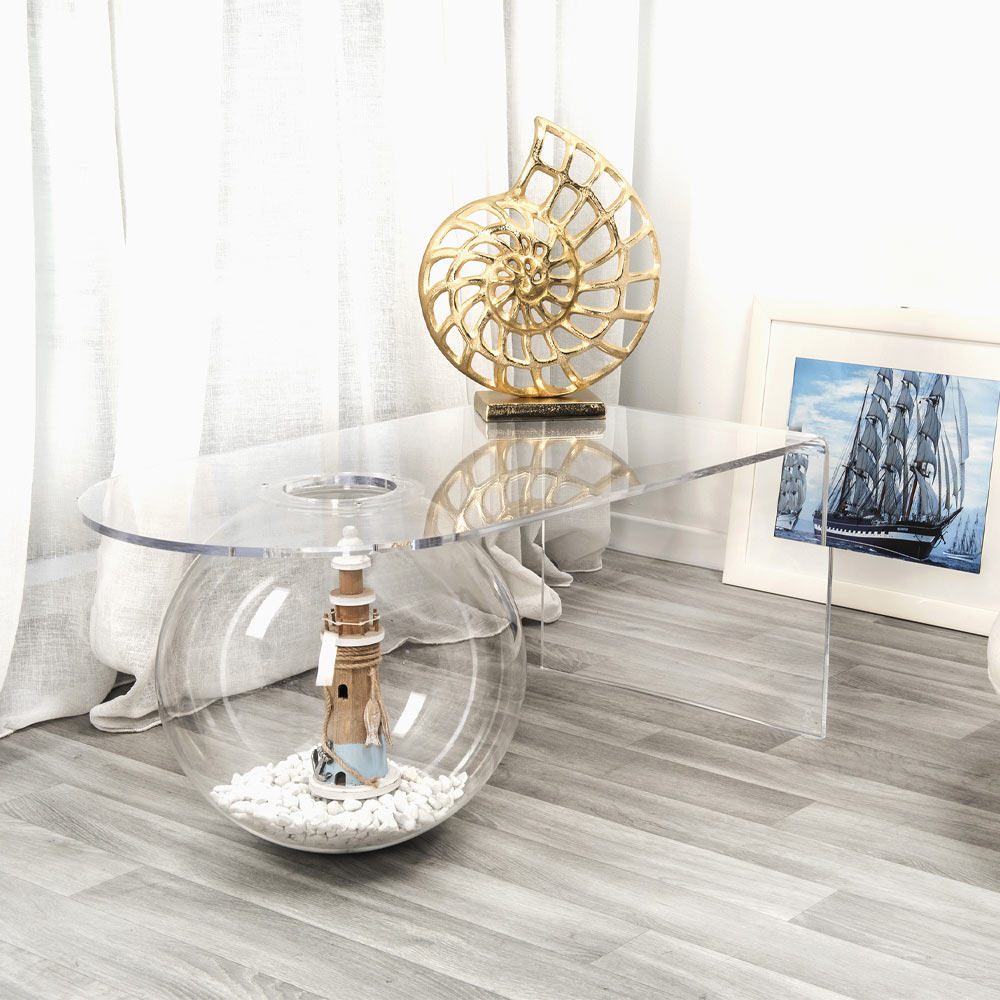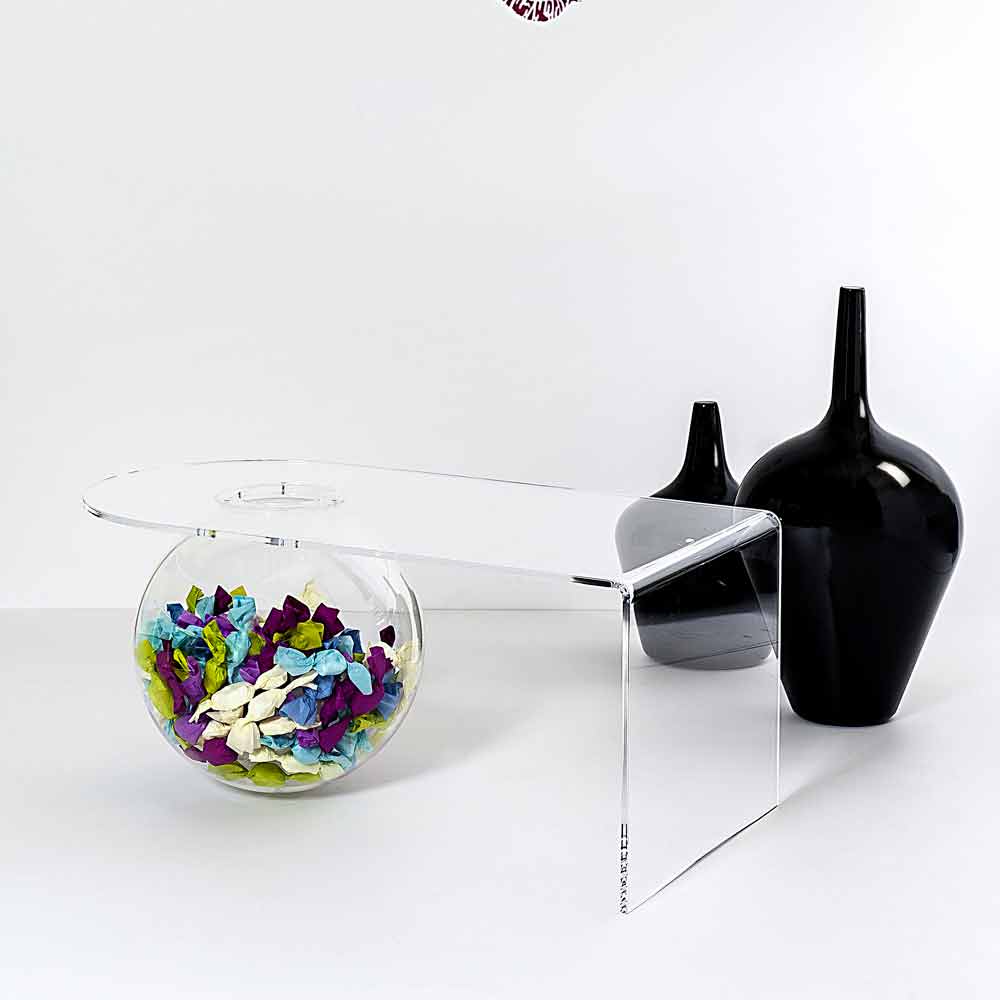 Table basse en plexiglas PMMA de polymère 100% vierge, façonnée au laser et réalisée par thermoformage à haute température. Bolly dispose d'une structure sphérique qui peut servir de pot pour les fleurs, d'acquarium ou, tout simplement, de boîte à rangement.