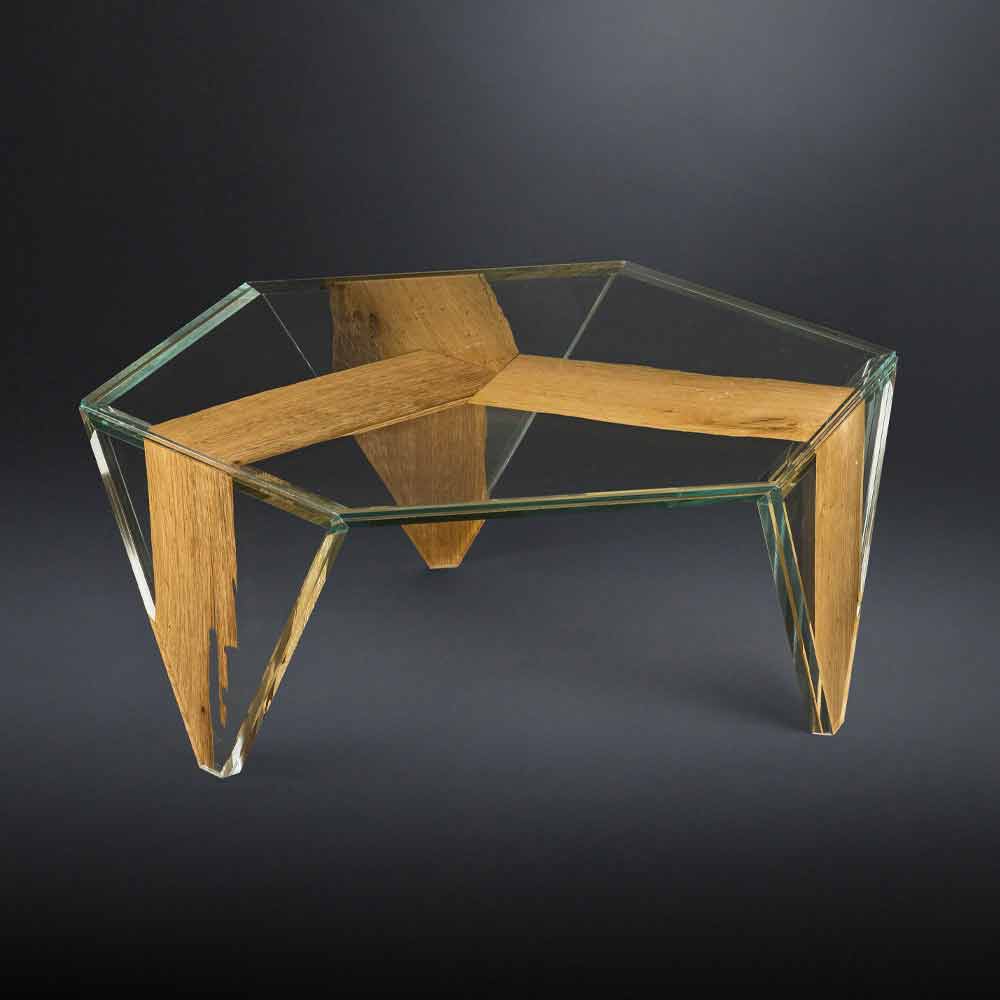 Table basse avec plateau hexagonalentièrement fabriqué en Italie en verre couplé (10 + 10 mm) à l'intérieur duquel une fine section de briccola en bois de chêne est insérée. De l'union entre le charme du bois et ses veines qui rappellent la nature et l' élégance intemporelle du verre , qui rappelle la transparence de l'eau, naît un accessoire d'ameublement exclusif , caractérisé par une forte personnalité raffinée . Sa force est représentée par la forme originale et par la merveilleuse combinaison de finitions et de matériaux qui augmentent sa valeur sans jamais négliger l'aspect fonctionnel fondamental souligné par la fabrication 100% Made in Italy et l'utilisation de matières premières de qualité. pour offrir la table basse parfaite idéale pour compléter avec style tout espace de vie au goût contemporain.