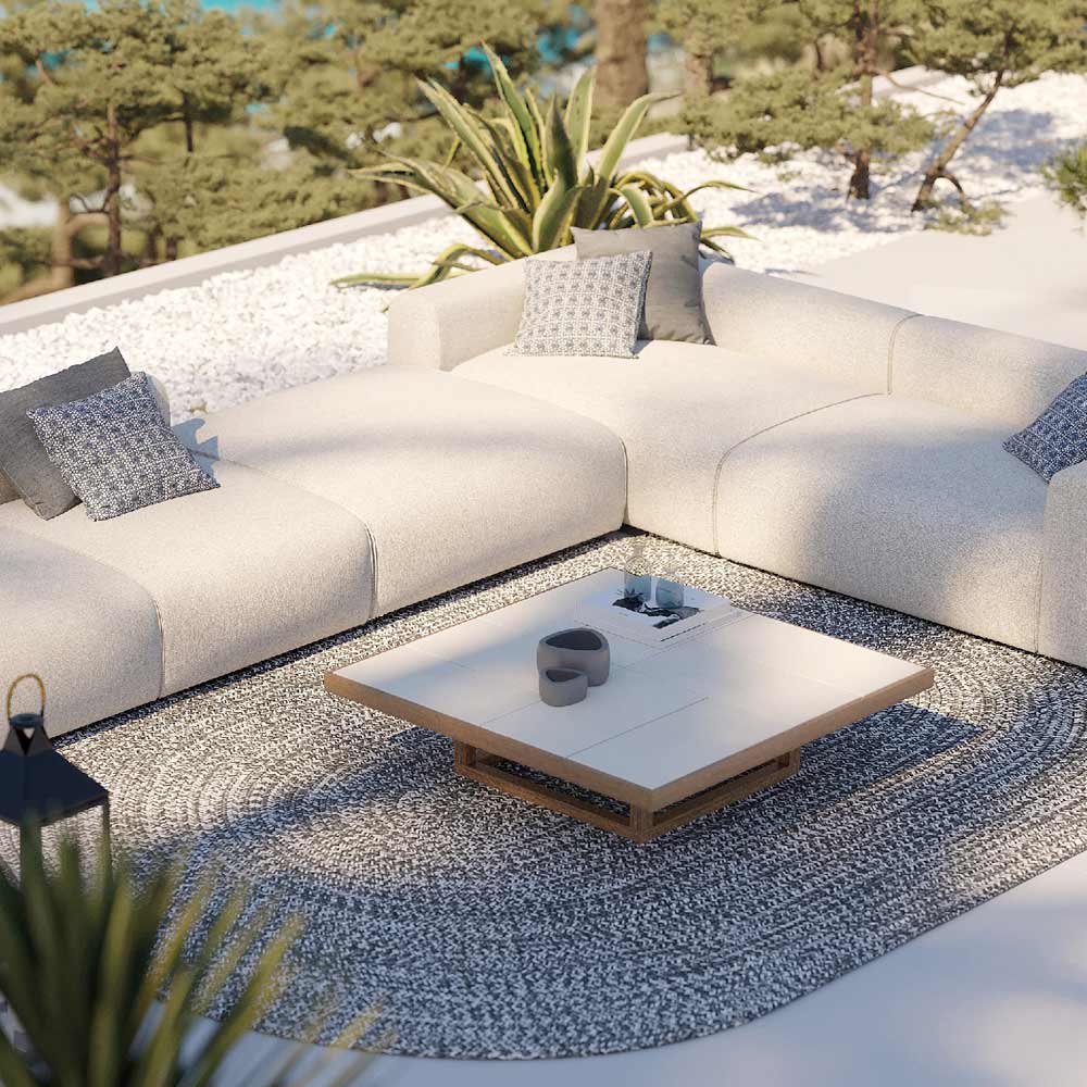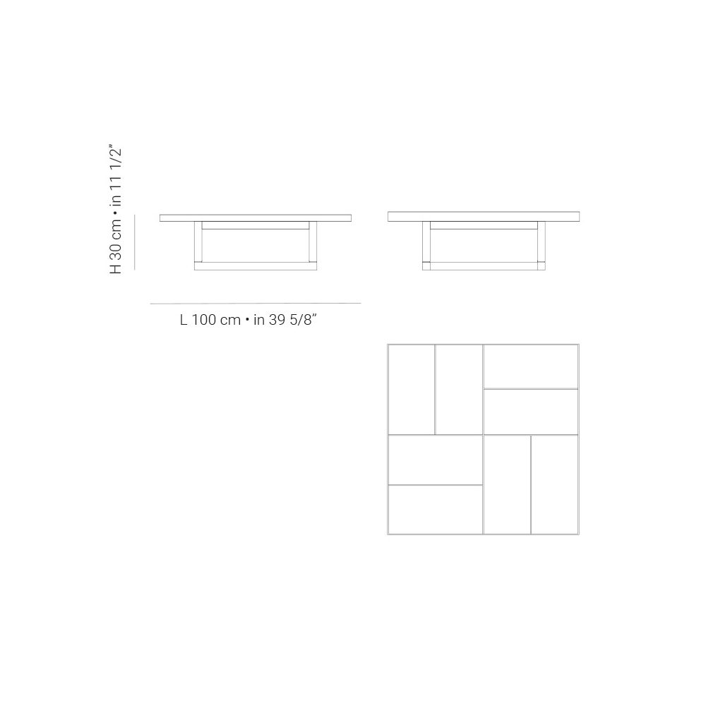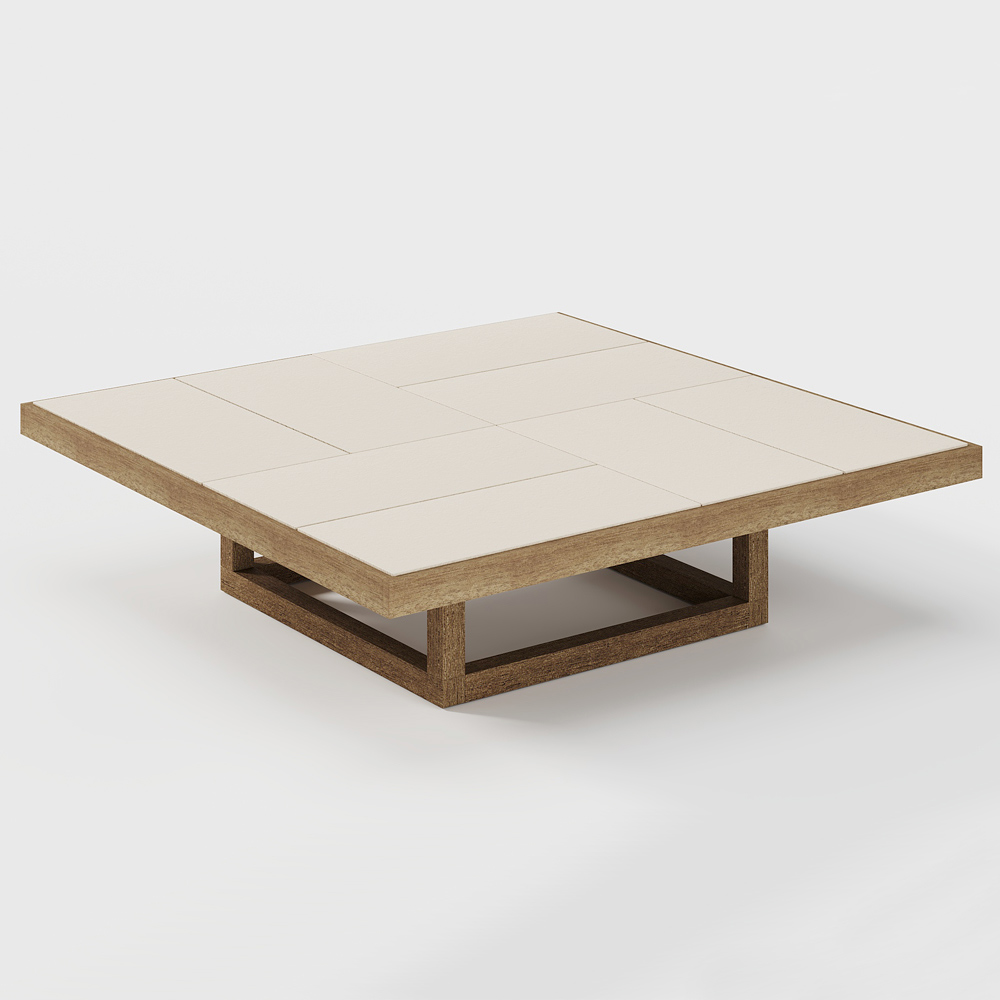 Table de jardin basse réalisée avec une base en bois d'Iroko et un plateau en dalle de grès . Il provient d'éléments minimaux et fonctionnels, dont le caractère découle de l'attention portée aux détails et des proportions et combinaisons d'éléments horizontaux et verticaux. Le design de son plateau se caractérise par un motif géométrique linéaire obtenu en combinant différentes dalles de grès qui dessinent le plateau, donnant à la table caractère et personnalité.