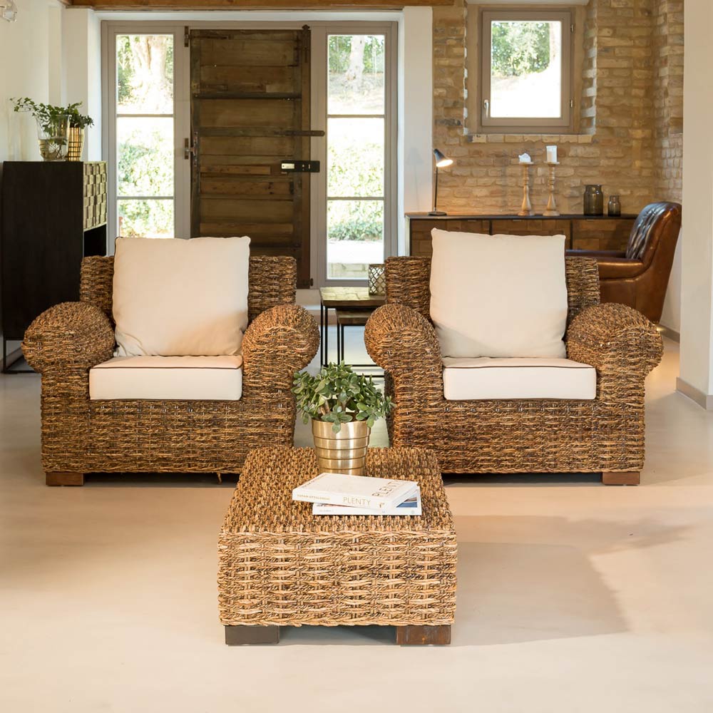 Table basse d'extérieur en fibre d'abaca naturellemaintenue . La table basse appartient à toute une collection qui se singularise par des accoudoirs cylindriques arrondis et un tissage dense raffiné en fibre naturelleabaca, dérivée du bananier . Les sièges sont grands et équipés de coussins confortables . Les produits de cette collection conviennent pour meubler les espaces extérieurs abrités tels que les porches, les balcons, les terrasses, les vérandas et les gazebos, en animant les environnements avec une chaleur et un style uniques.