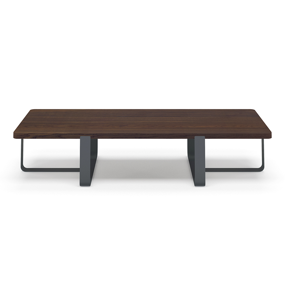 chêne teinté fumé et une base en métal à large bande disponible en différentes finitions.