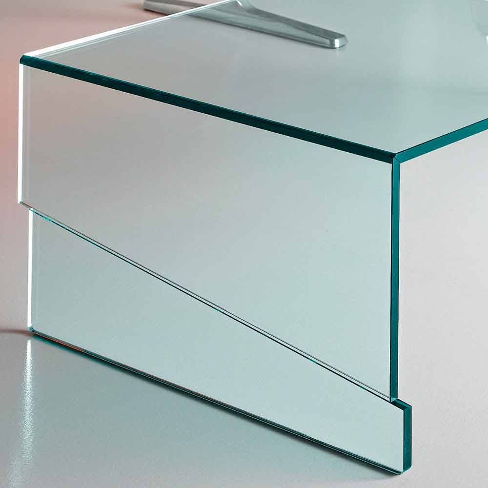 Entièrement réalisé en verre transparent , il se caractérise par des faces latérales découpées et soudées en porte -à-faux et des surfaces d'appui réalisées selon une technologie qui se positionne au service du design.