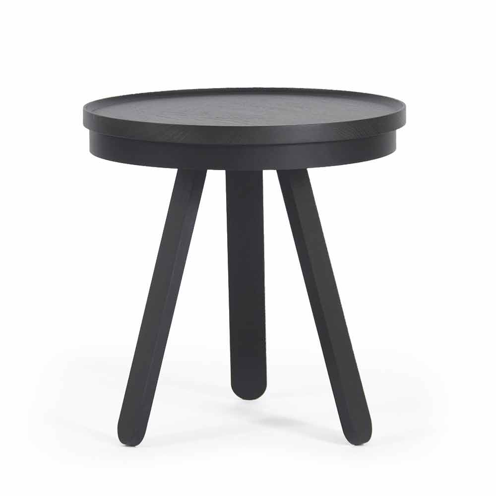 Table basse en bois massif et acier avec plateau rond.
