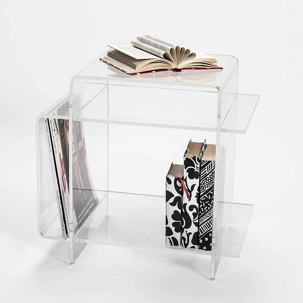 Table design en plexiglas transparent fabriqué en Italie, Gosto Table d'appoint / table de chevet polyvalente à 3 tablettes, inspirée de la géométrie des années 1970, en plexiglass 100% polymère vierge vierge, découpée au laser et pliée à haute température.