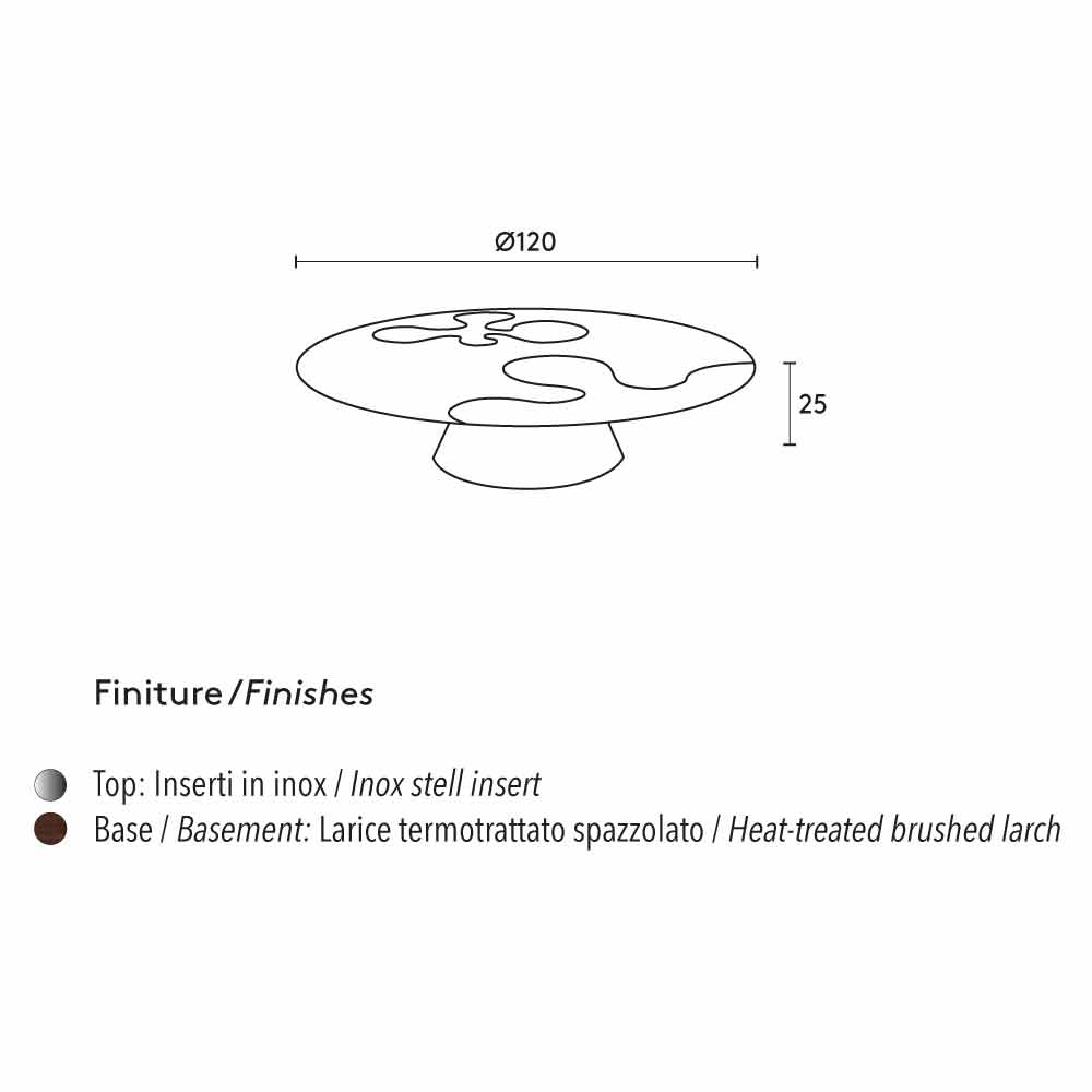 Table de salon caractérisée par un plateau avec motifs en alu inox. Pied conoque en larice traité termiquement brossé.