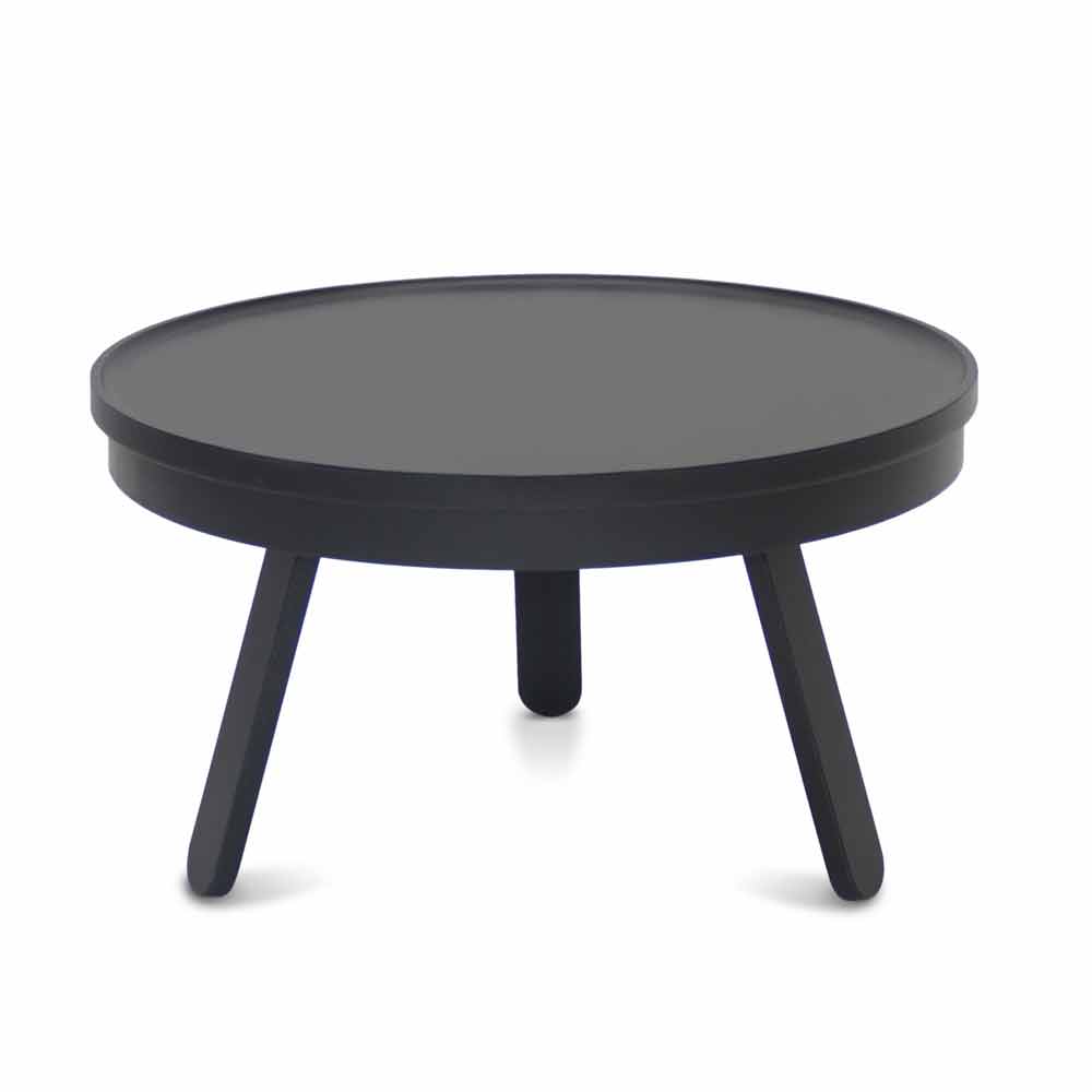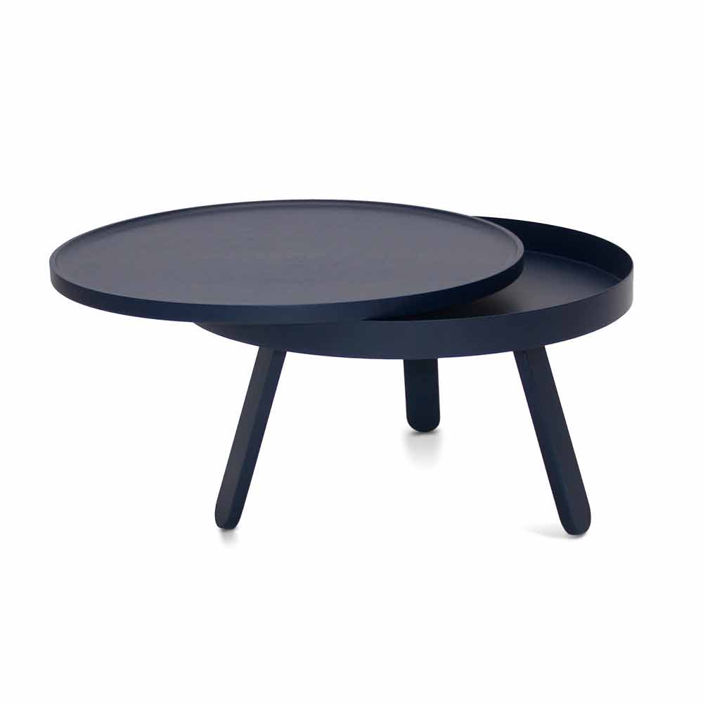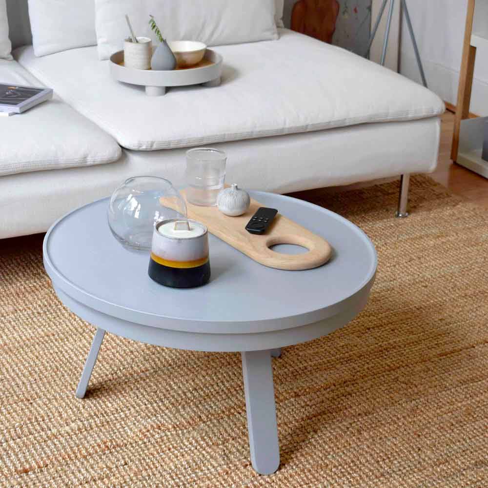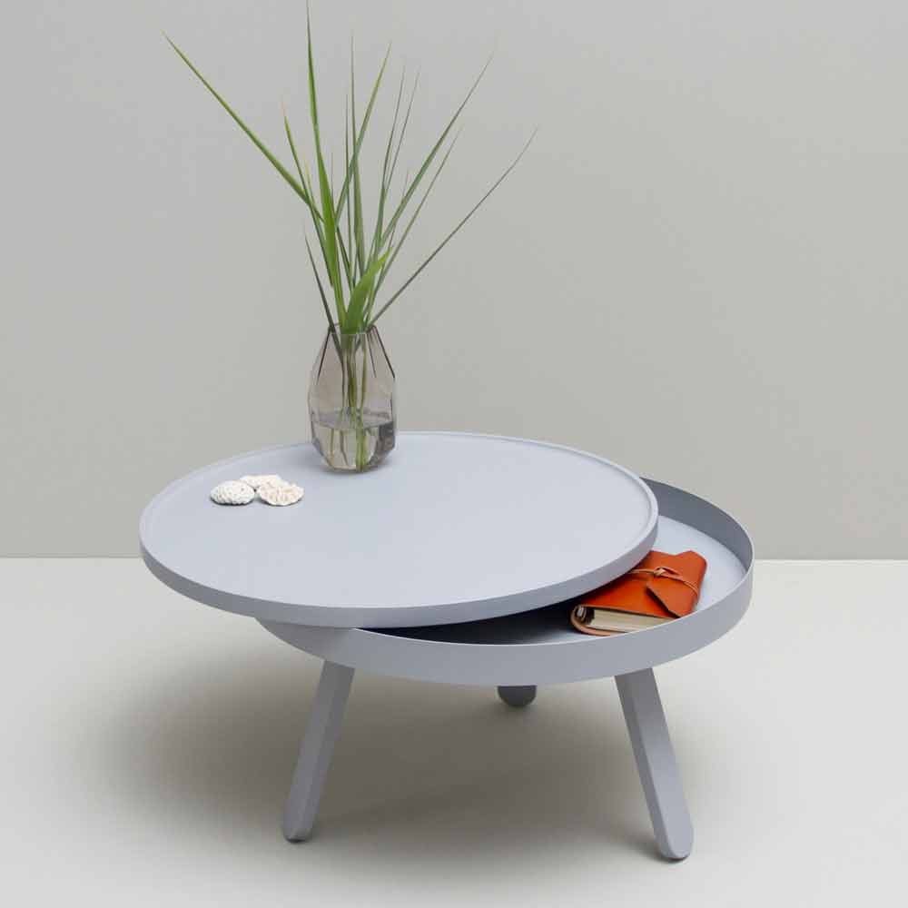 Table basse ronde en bois massif et acier avec rangement.